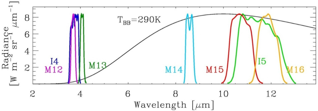 Relative Spectral Response of the VIIRS TEBs overlaid with spectral radiance of the BlackBody at 290 K [7].