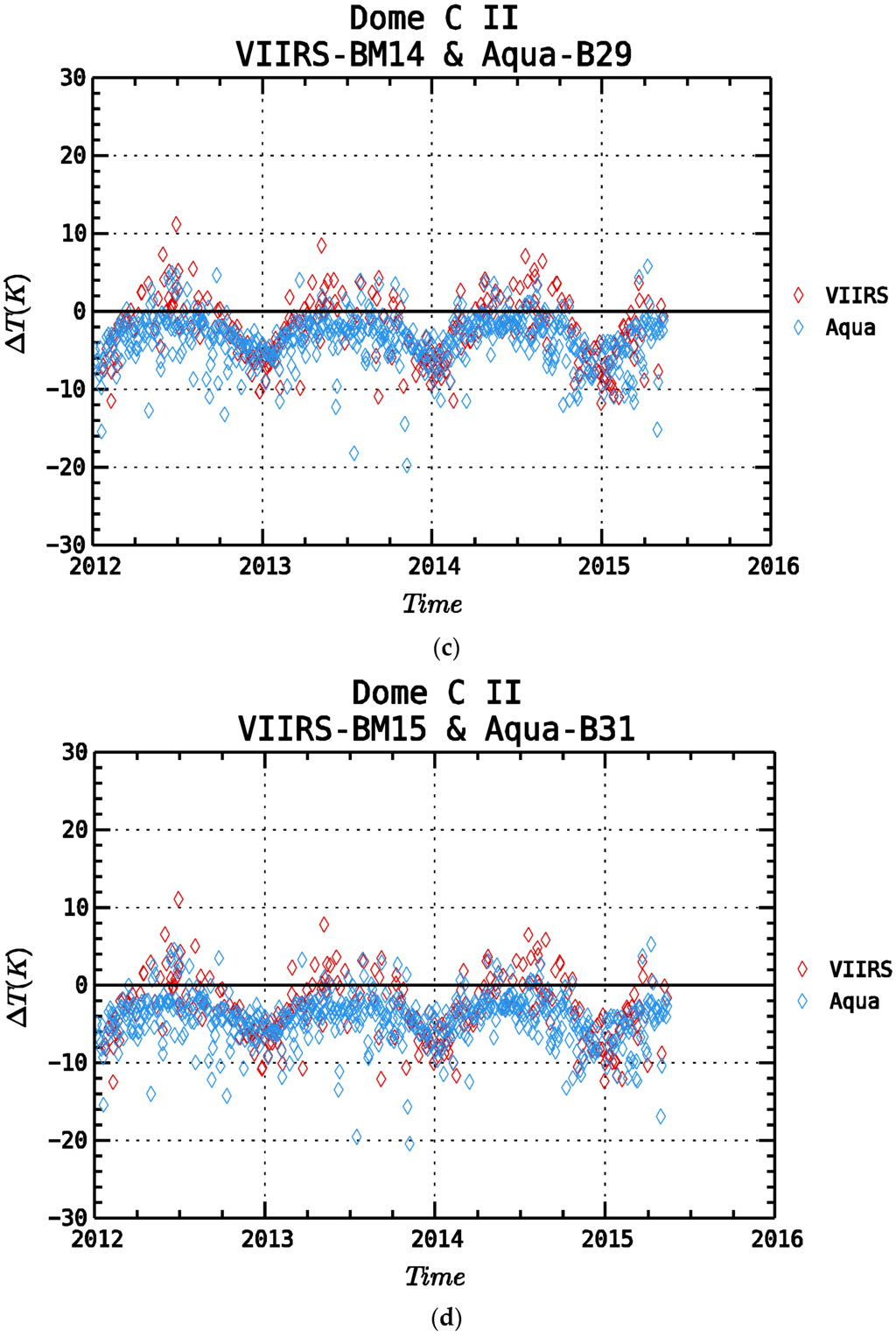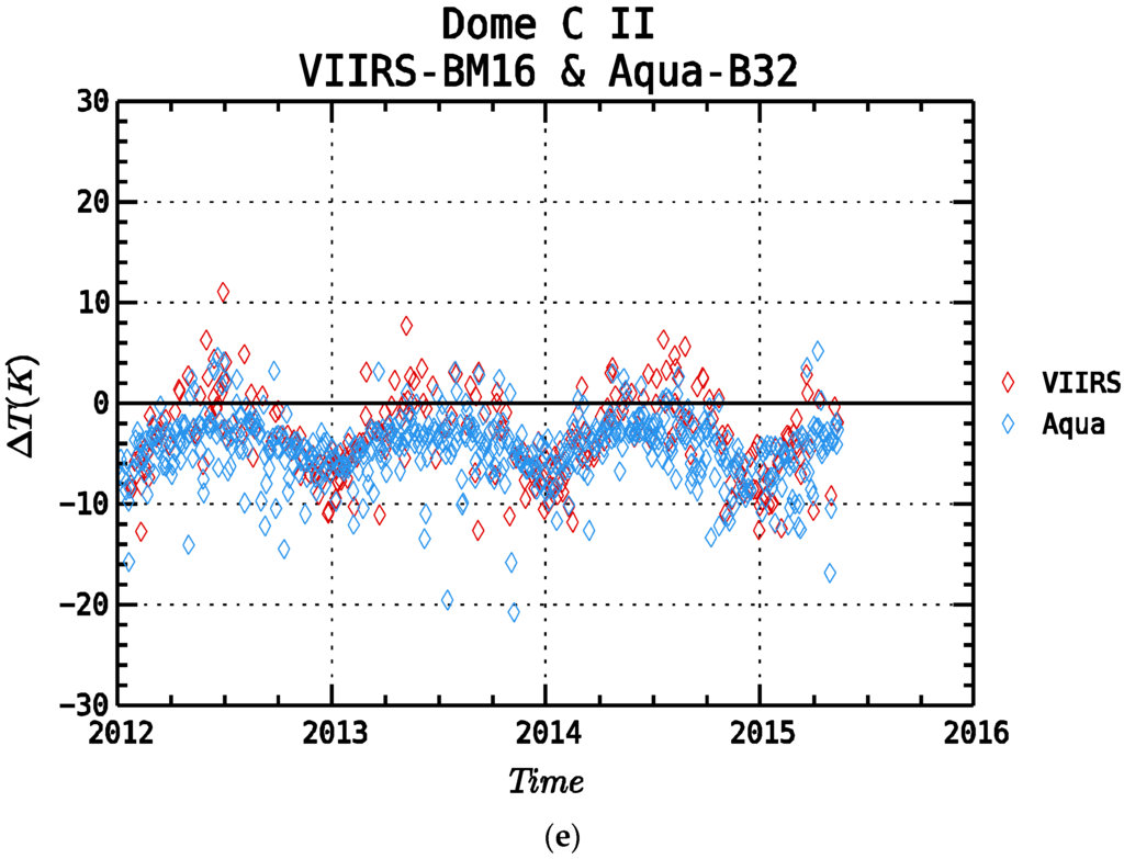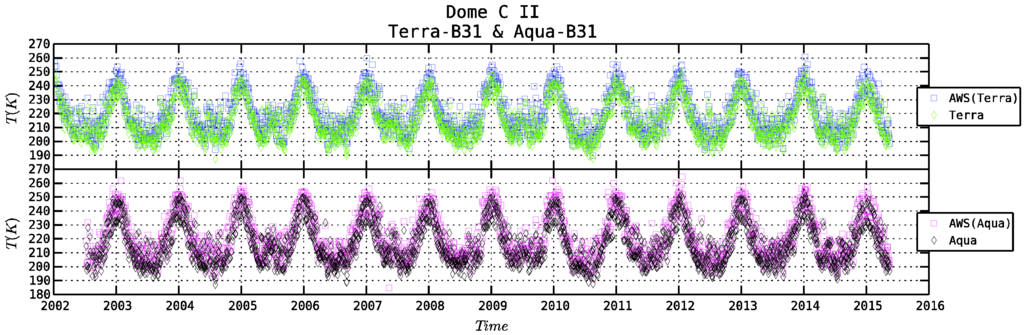 Additionally, the Dome C site is characterized by the Concordia research stations jointly operated by research scientists from France and Italy. An AWS, operated by Univ. Wisconsin, has been fully functional since installed in 1995. The AWS is physically installed approximately three meters above the ground base at Dome C. The AWS measurements are calibrated with a radiometric accuracy of ±0.5 K over a range of approximately 233 K–293 K respectively. Additionally, the typical errors were less than 1.0 K for measurements varying from approximately 198 K–298 K [19]. As of May 2015 a twenty year record of various meteorological measurements have been archived that serve as a great ground reference to assess the calibration stability and consistency of MODIS and VIIRS sensors. Figure 5 shows the lifetime temperature observations from both AWS and the MODIS measurements over Dome C since 2002. Based on the trends it can be seen that the lifetime trends are very stable with mean temperatures at approximately 220 K, with seasonal oscillations of approximately ±25 K. Thus the Dome C site provides a useful reference to assess the lower order deficiencies in calibration models for systems such as MODIS and VIIRS.