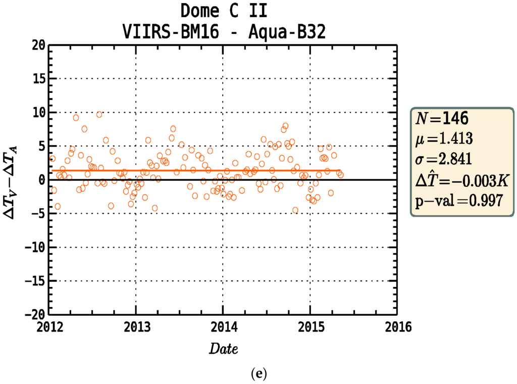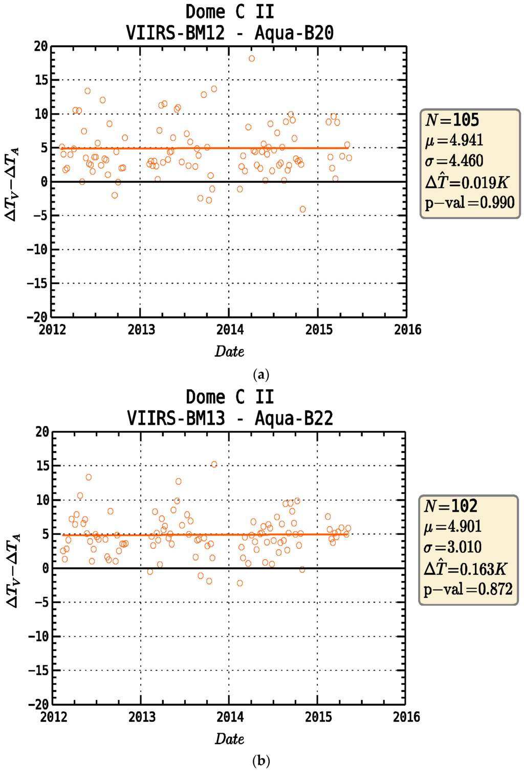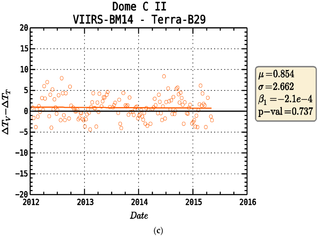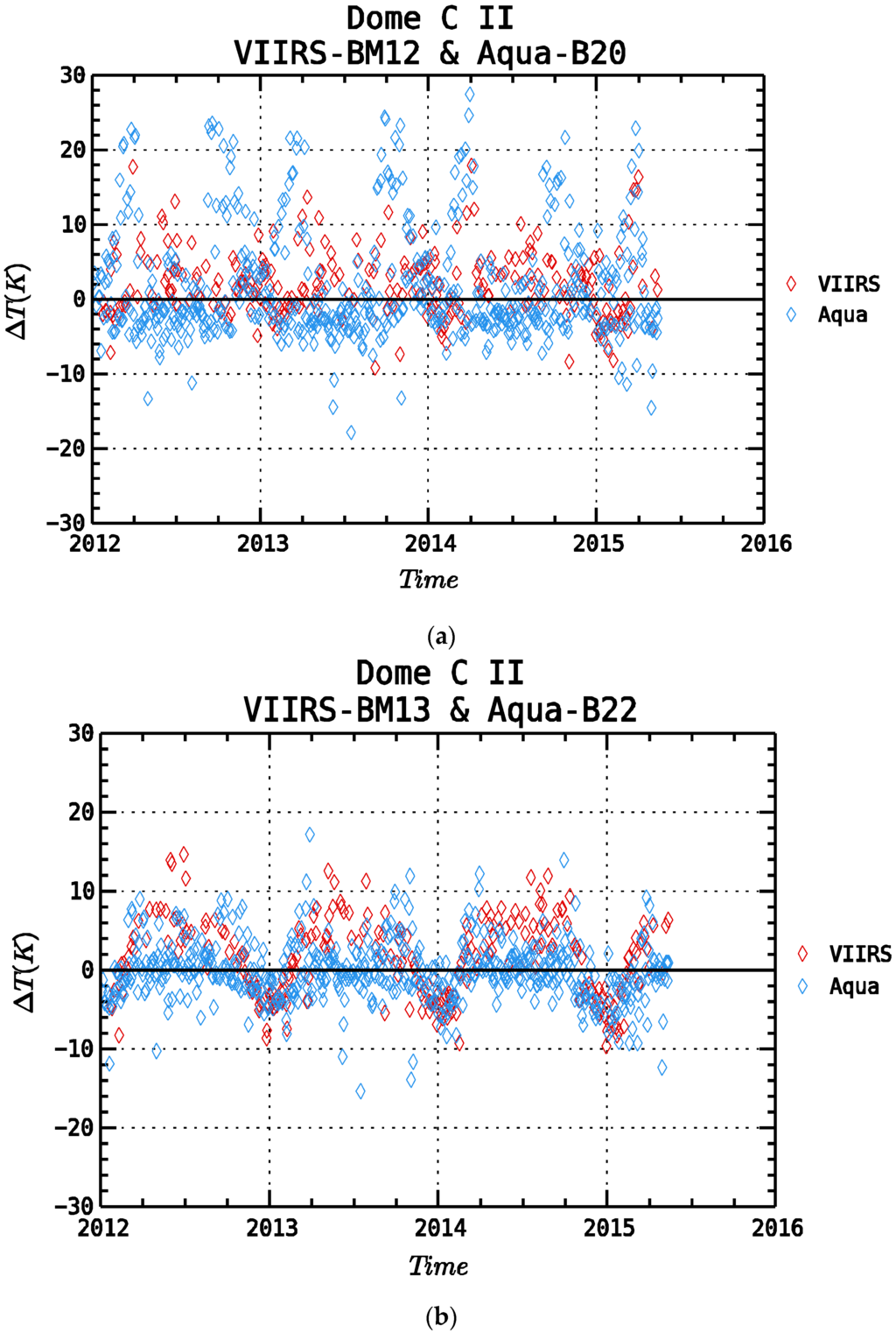 In the current work, the AWS is the proxy that is employed to assess the calibration consistency and stability of A-MODIS and S-VIIRS since January 2012. The Dome C measurement extractions from the two instruments are described as follows. About 250 nadir viewing Dome C scene acquisitions were identified for both instruments. These scenes were screened for clouds using two filtering steps. The first set of cloud screening was performed using the level 2 cloud mask products. Further, a clear sky restore was performed for MODIS using the algorithm mentioned in [20]. Antarctica presents a significant challenge to discriminate clouds from surface, where the surface is often colder than cloud. In order to obtain the maximum number clear-sky the MODIS clear-sky-restore algorithm was used to identify clear-sky pixels incorrectly flagged as cloudy. Unfortunately, the inversions required for this test can not be attained with the limited number VIIRS bands. Next, the spatially equivalent pixels were aggregated up for both the instruments. The total Dome C area covered was a small square region of 20 km × 20 km with the center pixels corresponding to the above mentioned latitude and longitudes of the Dome C site. After acquiring the matching co-located data, the L1B radiances from both the sensors is converted to a retrieved B.T. using the Planck equation and the spectral center wavelengths for the matching wavelengths. The 10-min average AWS data closest to the scene acquisitions is separately recorded. The data source used for this research work is as follows: For A-MODIS the latest collection C6 L1 B radiances were used, the latest version V3.1 L1B radiances for VIIRS from the Land PEATE distribution. The data are acquired from the site provided in [21]. Further, the AWS measurements are made available by the Antarctic Meteorology Research Center at the University of Wisconsin. The data can be downloaded from reference shown by [22].