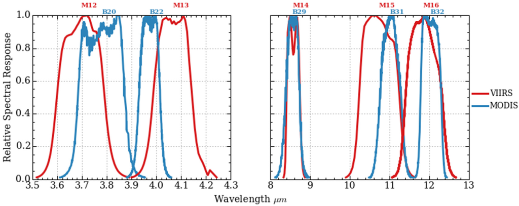 S-VIIRS has two types of bands providing ground observations at different spatial resolutions. The moderate-resolution (M-) bands have a spatial resolution of 750 m, which is similar to the 1 km bands of MODIS. Additionally, to achieve a wide dynamic range some of the M-bands are dual gain, with high gain intended for detection at the low end of the dynamic range and the low gain for the higher end. M13 is the only dual gain TEB band which is primarily used for fire detection and is similar to MODIS bands 21 and 22. The two imaging (I-) bands are fine resolution that have a spatial resolution of 375 m. The I4 band is very similar to the MODIS band 20 while the I5 band covers MODIS bands 31 and 32, respectively. Figure 3 shows the Relative Spectral Response (RSR) of all the VIIRS TEB overlaid with the response curve of the BB radiance at a set temperature of 290 K [7]. It is important to note the RSRs for 3 µm–4 µm band pairs cover parts of the spectrum influenced by scattered solar irradiance. Table 1 gives the spectral center wavelengths of the VIIRS TEBs along with the matching MODIS TEB. In the rest of the paper we use the following match up of M-bands as mentioned in Table 1 for cross comparison of the two instruments.