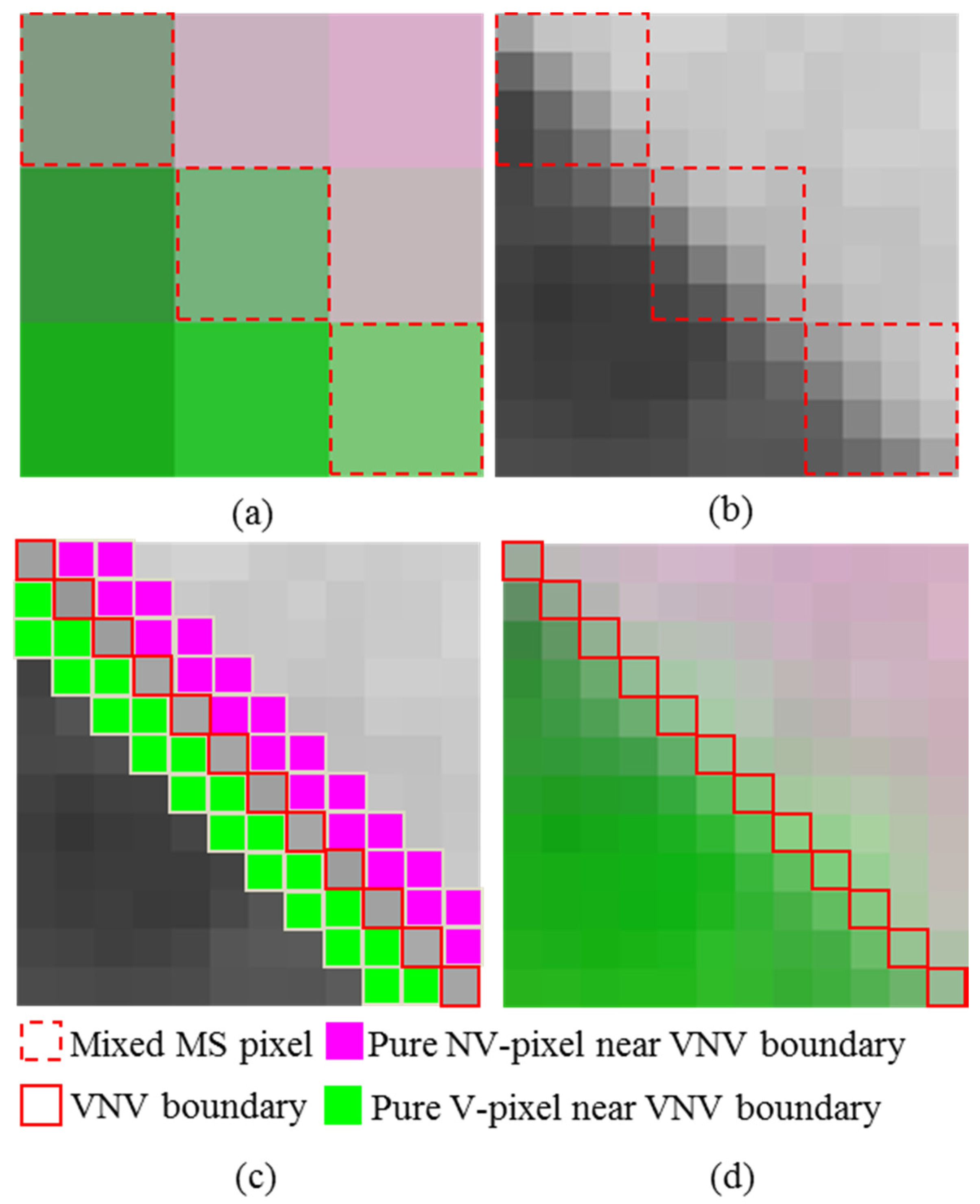 Mixed multispectral (MS) sub-pixels and the corresponding PAN and fused images. (a) The mixed MS pixels at MS resolution; (b) the PAN pixels corresponding to the MS pixels in (a); (c) PAN (edge) pixels across vegetation and non-vegetation (VNV) boundaries and pure PAN (V and NV) pixels near the VNV boundaries; (d) Gram–Schmidt (GS)-fused image overlain with VNV boundaries from the PAN image.
