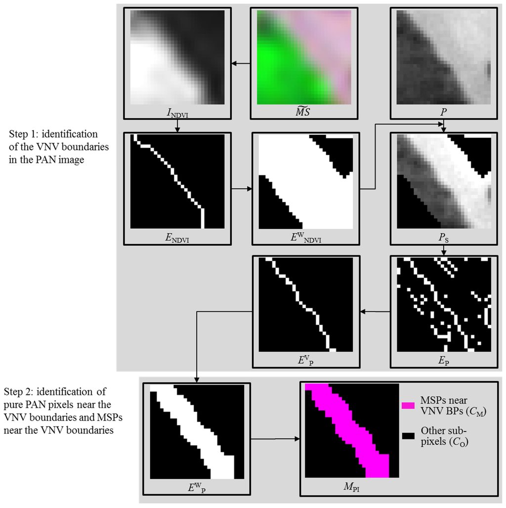 After the up-sampled MS image is produced by up-sampling the MS image to match the pixel size of the PAN image, MSPs near VNV boundaries are identified according to the procedure shown in Figure 2.