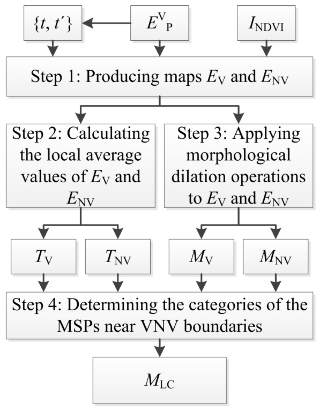 Moreover, ideally, vegetation pixels will lie on one side of the VNV boundaries and the non-vegetation pixels on the other side. Hence, a vegetation pixel map, MV, and a non-vegetation pixel map, MNV, are generated by applying morphological dilation operations to the vegetation edge pixels map, EV, and the non-vegetation edge pixels map, ENV. Finally, MV, MNV, TV and TV, along with the NDVI, are used to determine the land cover category (i.e., vegetation or non-vegetation) of each identified MSP. The flow diagram for the classification of the identified MSPs is shown in Figure 3, and the details of each step of this procedure are listed below.