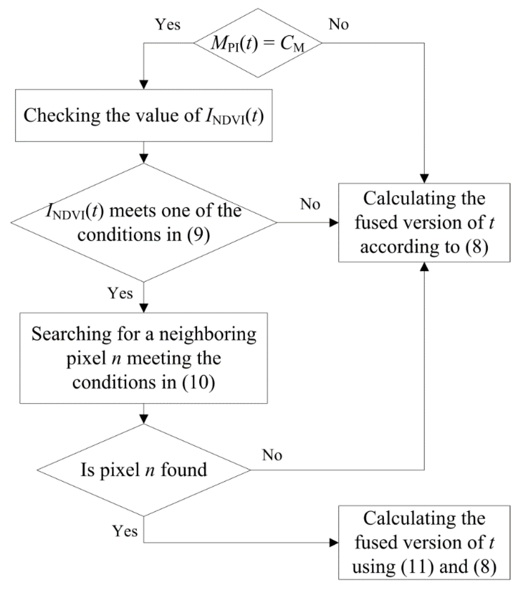 As the flow diagram shown in Figure 4, each MS sub-pixel is fused according to the appropriate category (i.e., either the identified MSPs or the remaining sub-pixels) in MPI.