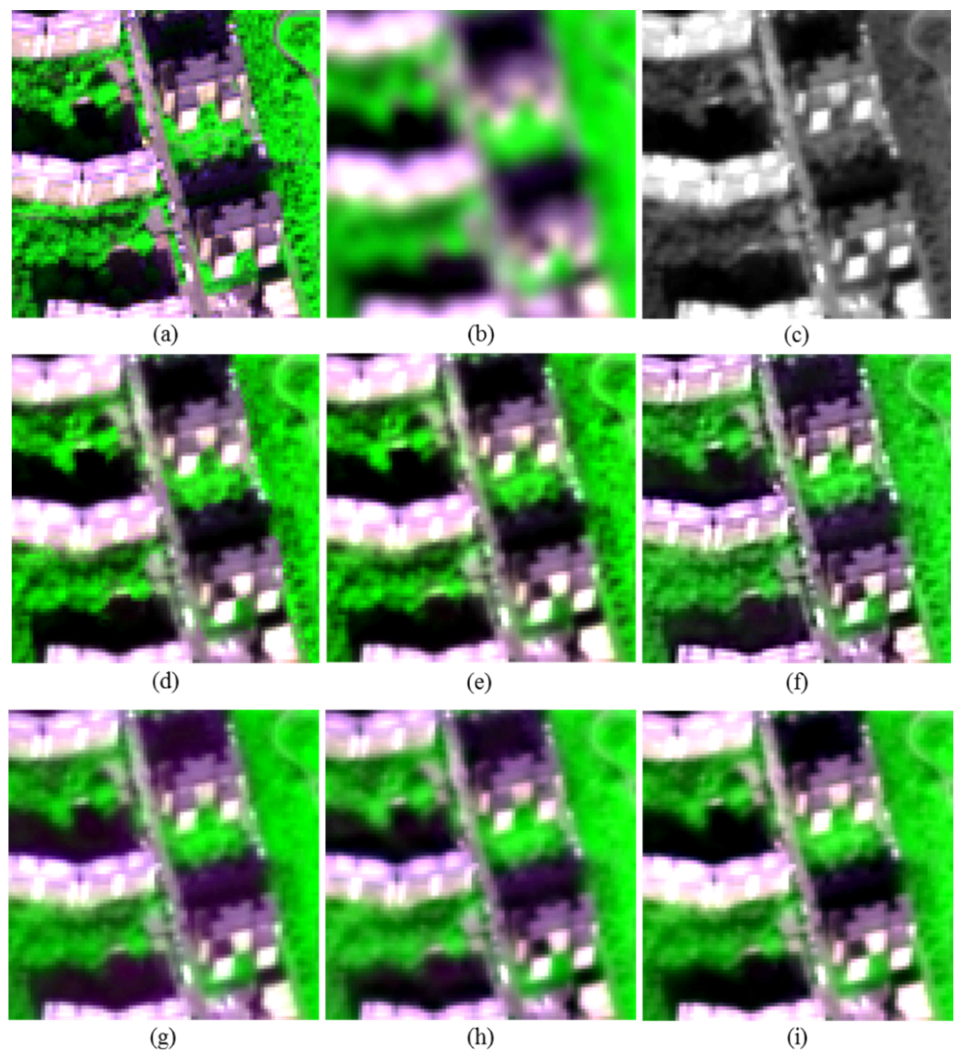 The 84 × 84 pixel subsets of the MS images and the corresponding fused images produced from the degraded WorldView (WV)-2 dataset: (a) true 2-m MS image; (b) up-sampled version of the 8-m MS image; (c) 4-m PAN image; and the results of (d) UHR fusion, (e) HR fusion, (f) PS fusion, (g) GS1 fusion, (h) GS2 fusion and (i) GSA fusion.