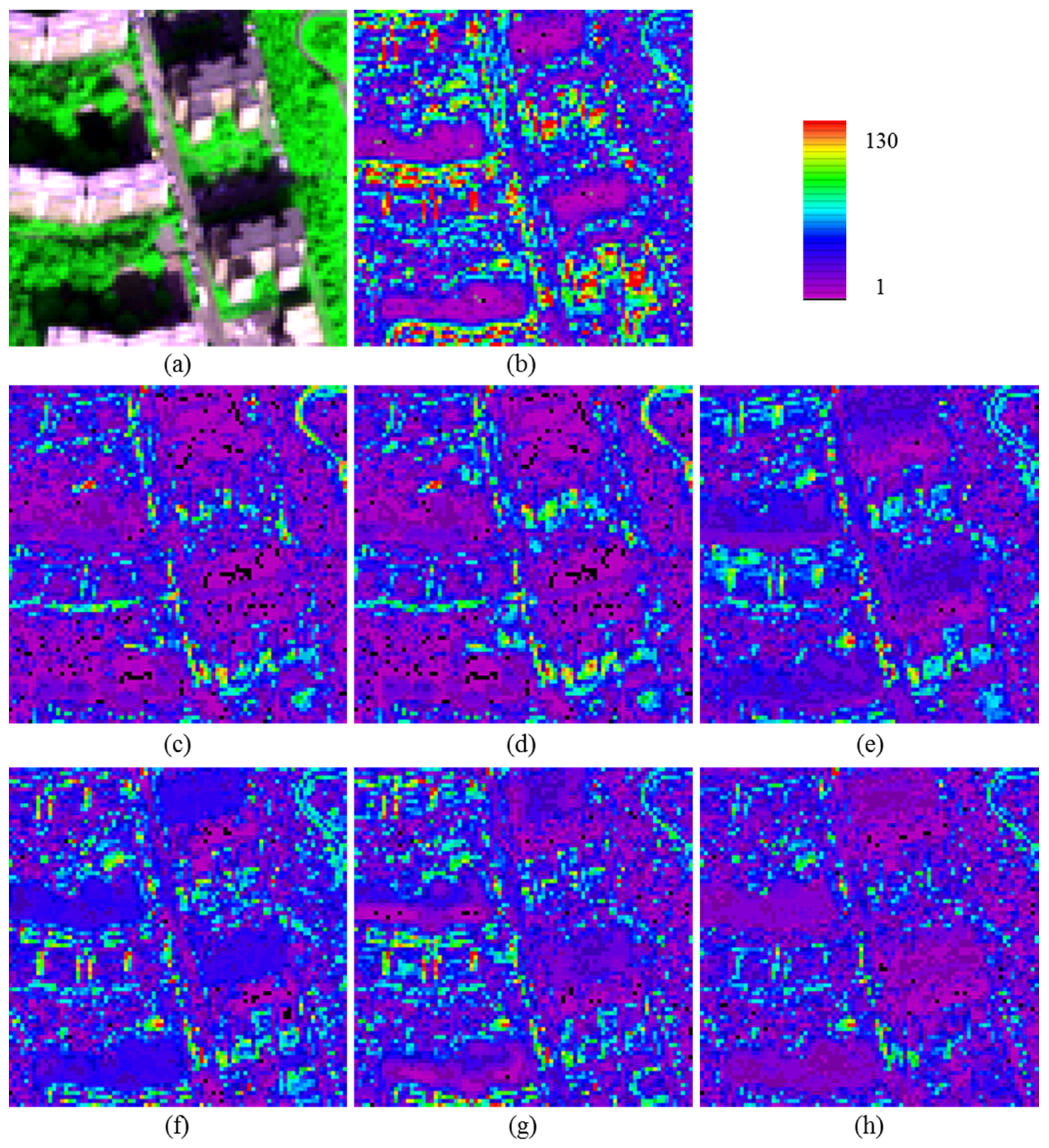 The 84 × 84 pixel subsets of the original images and the error maps of the fused images produced from the degraded WV-2 dataset: (a) true 2-m MS image; and the error maps for the results of (b) the up-sampled version of the 8-m MS image; (c) UHR fusion; (d) HR fusion; (e) PS fusion, (f) GS1 fusion; (g) GS2 fusion and (h) GSA fusion.