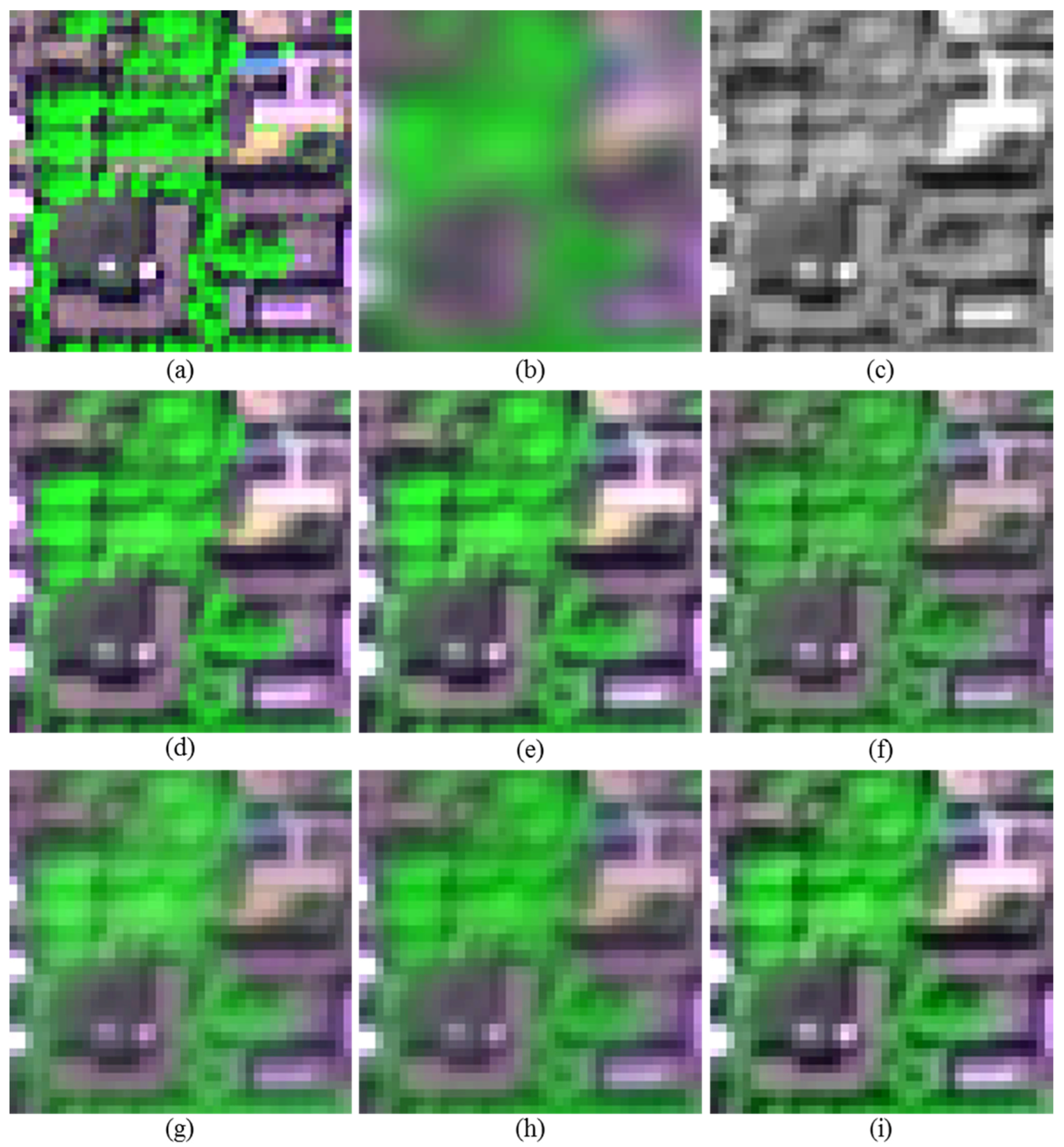 The 64 × 64 pixel subsets of the MS images and the corresponding fused images produced from the degraded IKONOS dataset: (a) true 4-m MS image; (b) up-sampled version of the 16-m MS image; (c) 2-m PAN image; and the results of (d) UHR fusion; (e) HR fusion; (f) PS fusion; (g) GS1 fusion; (h) GS2 fusion and (i) GSA fusion.