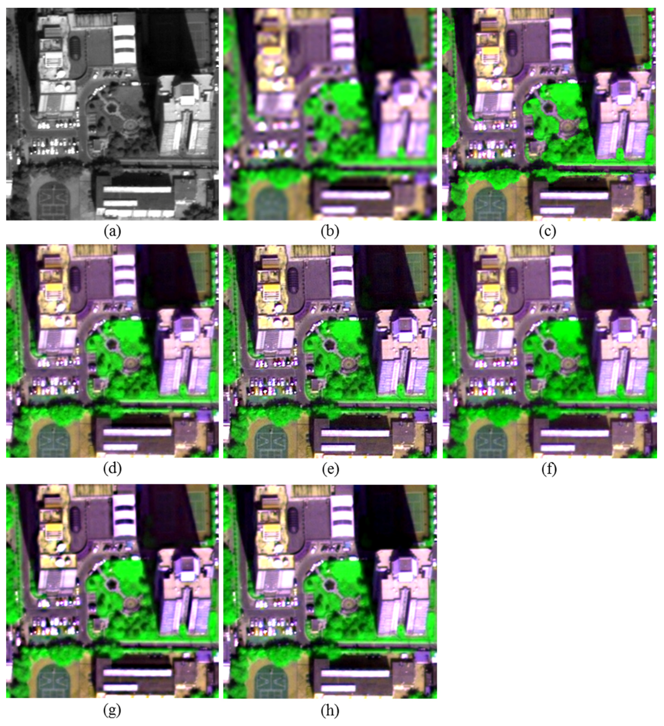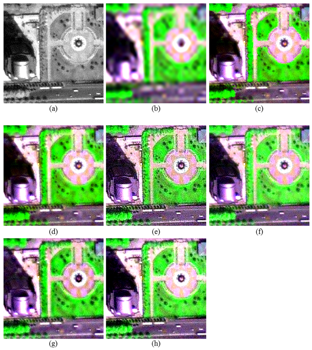 - Vivone, G.; Alparone, L.; Chanussot, J.; Dalla Mura, M.; Garzelli, A.; Licciardi, G.A.; Restaino, R.; Wald, L. A critical comparison among pansharpening algorithms. IEEE Trans. Geosci. Remote Sens. 2015, 33, 2565–2586. [Google Scholar] [CrossRef]