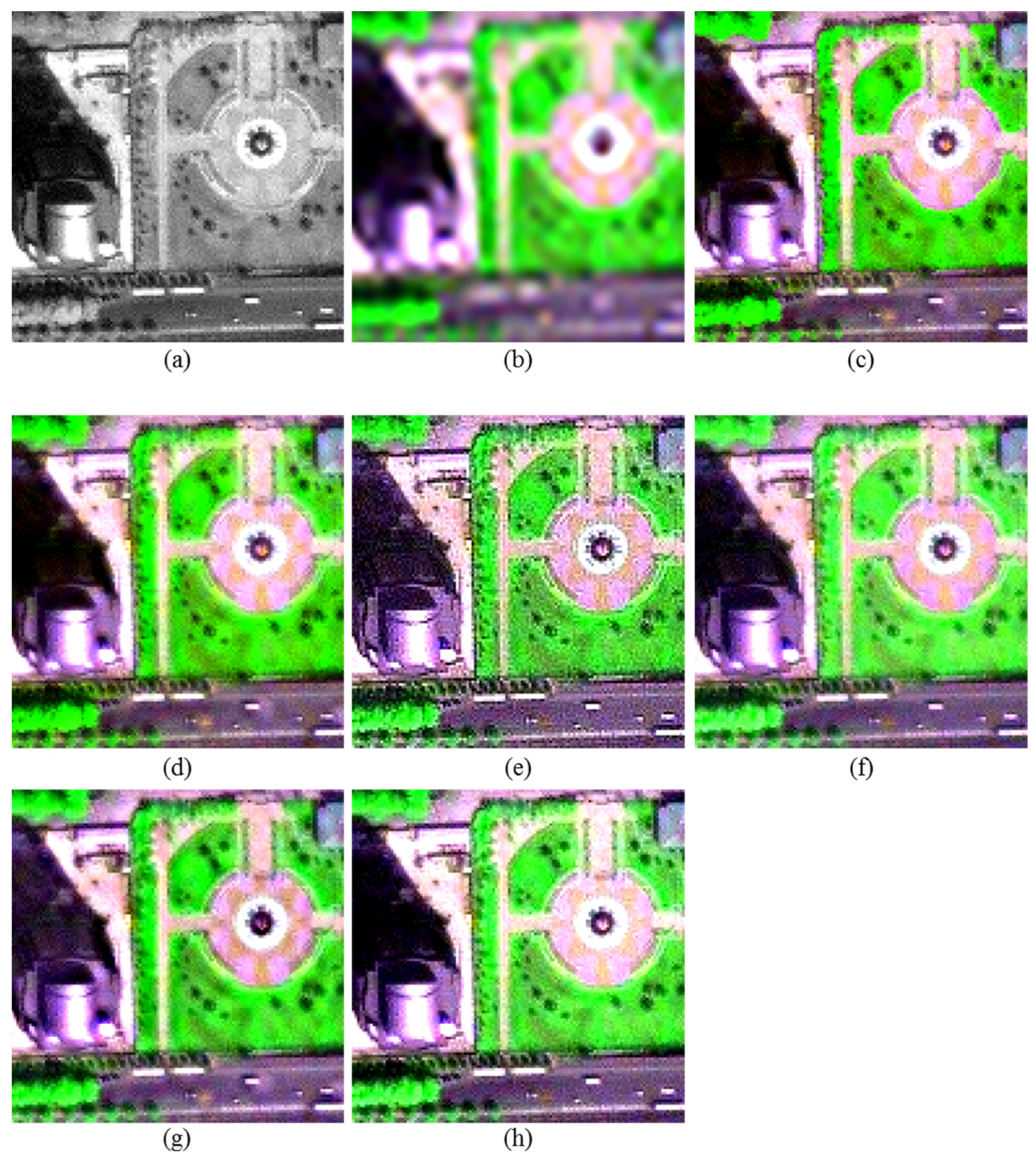 The 256 × 256 subsets of the MS and PAN images and the corresponding fused images produced from the original WV-2 dataset: (a) 0.5-m PAN image; (b) up-sampled version of the 2-m MS image; and the results of (c) UHR fusion, (d) HR fusion, (e) PS fusion, (f) GS1 fusion, (g) GS2 fusion and (h) GSA fusion.