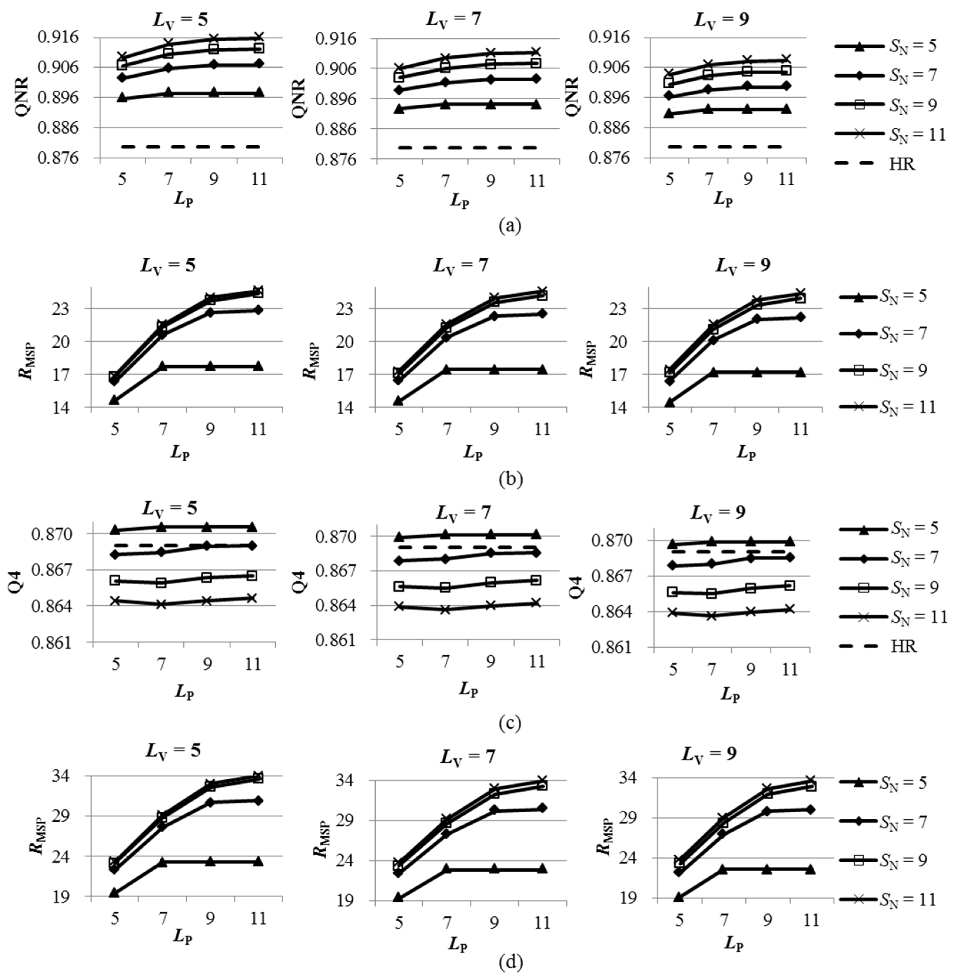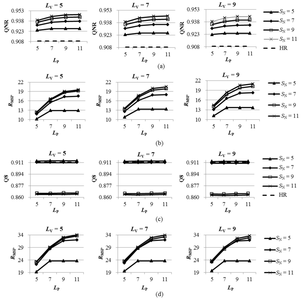 The best performances for the two degraded datasets are achieved by a value of 5 for LV and values of 7, 9 and 11 for LP, along with a value of 5 for SN. The best performances for the two original datasets are achieved by the fusion products generated using a value of 5 for LV and values of 7, 9 and 11 for LP, along with a value of 11 for SN. Although a value of 11 gives the poorest performance at the degraded scale, it performs the best at the original scale. This may be caused by the fact that the QNR is less sensitive to spectral distortions introduced by over-un-mixing of MSPs than the Q2n. Consequently, it is suggested that the values of LV and SN be set to 5 (i.e., 2R − 3), whereas the value of LP can be set to odd values in the range (2R − 1, 11) in cases where a 23-tag filter is employed to yield the up-sampled MS image.