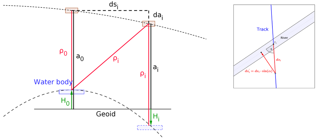 Equation (4) assumes that the along-track distance equals the horizontal distance between the satellite and the water body, i.e., the altimetry track is perpendicular to the water body. In practice, however, the track intersects the river at an angle α. The strongest water return then originates not from the intersection of the altimetry track and the river, but from a closer upstream or downstream position. Assuming a straight river in proximity, the distance between the footprint center and the nearest water body is (see Figure 1 right side). Therefore, the hooking parabola is dilated but not distorted.