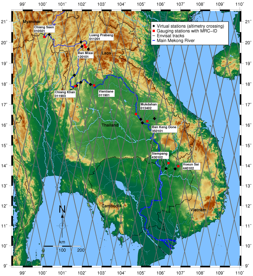 The method is trialed in a case study, namely the derivation of water-level time series along the Mekong River in South-East Asia and some of its tributaries. In terms of discharge and length, the Mekong River ranks among the 10 largest rivers in the world. Using satellite altimetry, Frappart et al. [27] have already investigated the lowest part of the Mekong basin south of Krong Stung Treng, where the river width exceeds 2 km. Birkinshaw et al. [28] studied the entire lower Mekong basin (the same region is investigated in the present study) using Envisat and ERS-2 data. They focused on the area south of Vientiane and one station further in the North, where the river is less than 500 m wide.