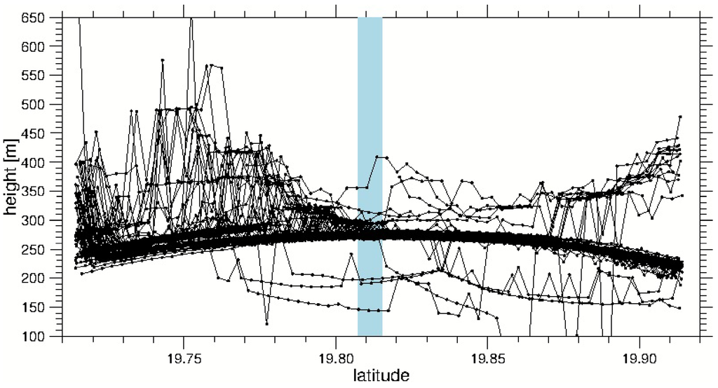 Envisat’s RA-2 instrument measures high-resolution data in the Ku- and S-bands with a frequency of 18 Hz, corresponding to a distance of approximately 365 m between two consecutive measurements. This study employs the Sensor Geophysical Data Record (SGDR) v2.1 data. In the study region, the bandwidth of the RA-2 instrument switches among 320 MHz, 80 MHz, and 20 MHz depending on the roughness of the topography [35]. Over rougher terrain the bandwidth is lowered which increases the tracking window of the altimeter. This prevents the altimeter to lose lock over rapidly changing heights. According to the smaller bandwidth the size of each bin is increasing and thereby the height resolution is decreasing. The different bandwidth are also called measuring modes.