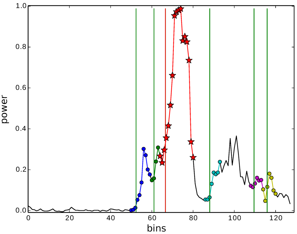 Our novel retracking method, MSR, was developed to improve the data quality of water-level time series, with special focus on the hooking effect. The method determines the sub-waveforms in Improved Threshold Retracker (ITR) data [8]. As an initial step, we consider here all ITR sub-waveforms, although only the first one is used for determining the water height. Figure 4 shows a typical waveform of a land-water transition, with the identified sub-waveforms marked by different colors. Over the water body itself, the first return and (and therefor the first sub-waveform) is caused by the reflection of the water. As the satellite retreats from the water, the first return signal most likely originates from land reflectance, and later sub-waveforms can be attributed to water returns. Thus, the first sub-waveform in the ITR waveform delivers good results over the water body, but yields no information on the hooking parabola. We assume that in each waveform, one of the sub-waveforms originates from water reflectance, but we cannot know which one. We can only assume that the water return yields the most intense sub-waveform. To find this sub-waveform, we define a weight for each subwaveform.