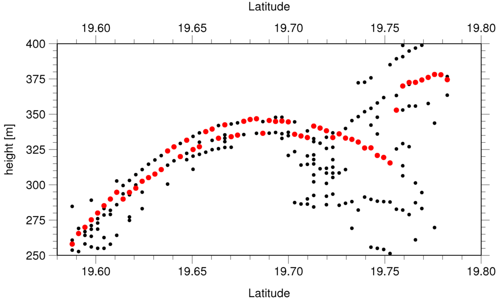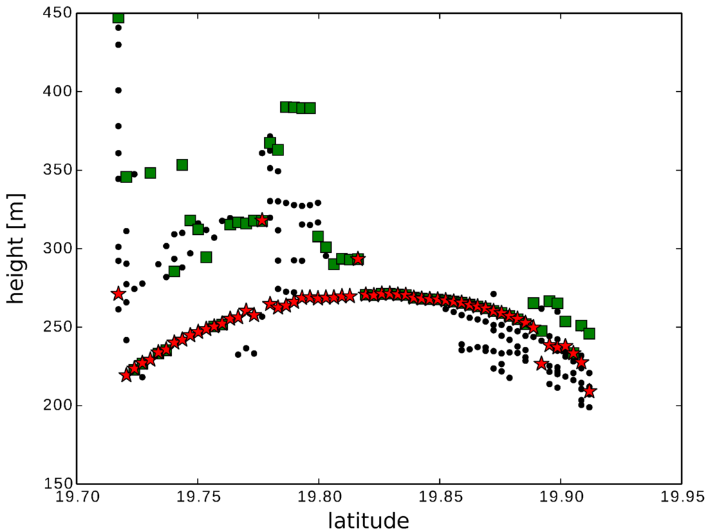 Figure 5 shows the MSR results for one crossing. The hooking parabola is clearly visible in the bundle of heights derived from all sub-waveforms (black dots), and the best sub-waveform (red stars) is usually caused by water reflection. The ITR results (green squares) turn out to be less suitable for extracting the hooking parabola.