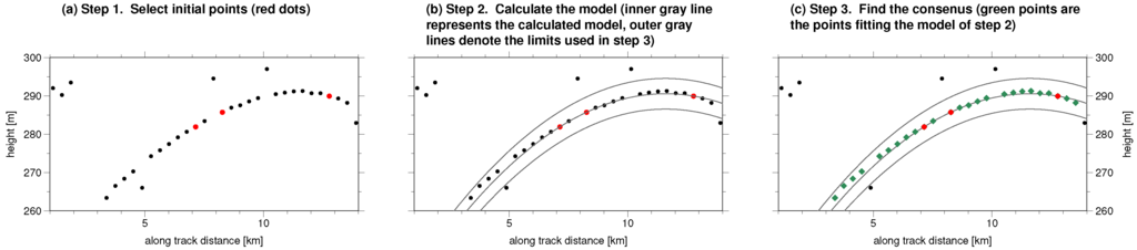 Sometimes, parabolic height profiles can result from the topography around the water body. To avoid such profiles, we impose three restrictions on Step 2 of the RANSAC algorithm. First, the hooking parabola is known to open toward the downside. Second, the parabola opening can be roughly estimated from Equation (4) . Third, the water height is roughly known (±25 m) from a topography model. Therefore, models that predict water heights outside of this window are discarded. Under these restrictions, the RANSAC algorithm may not find any model and the height determination may fail in that epoch.