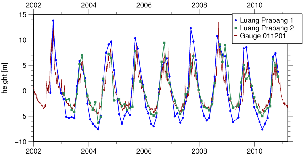 Birkinshaw et al. [28] published altimetry time series at Luang Prabang 2 and Vientiane and at downstream stations not considered in this study. In their study they use ERS-2 and Envisat data between 1995 and 2003 and 2002 and 2008 respectively. The altimetry data is retracked according to the shape of each waveform (ocean-like, flat patch and two quasi-specular). They adopted two outlier detection methods in their time series determination. Comparing the altimetric and gauging-station time series at Luang Prabang 2, they reported RMS values of 1.99 m and 1.24 m with 22 points and 16 points in the time series, respectively. The hooking approach yieldes an RMS value of 1.23 m and 1.20 m without and with outlier detection and the time series contains 76 and 73 data points of 79 available epochs respectively (see Table 2). Over the same period, the Vientiane station yielded RMS values of 0.41 m and 0.44 m with 29 points and 33 points in the time series, respectively. For the Envisat data between 2002 and 2008 there should be approximately 60 repeats, but due to the retracking scheme and the measurement quality only 25 repeats for Luang Prabang and 37 for Vientiane are available after retracking. Our results for the same station show RMS values of 1.63 m and 1.22 m with 70 and 67 data points of 82 available epochs in the time series. Although the time series obtained by Birkinshaw et al. [28] and our hooking approach are comparable in quality measured with the RMS, the former is constructed from fewer data points.