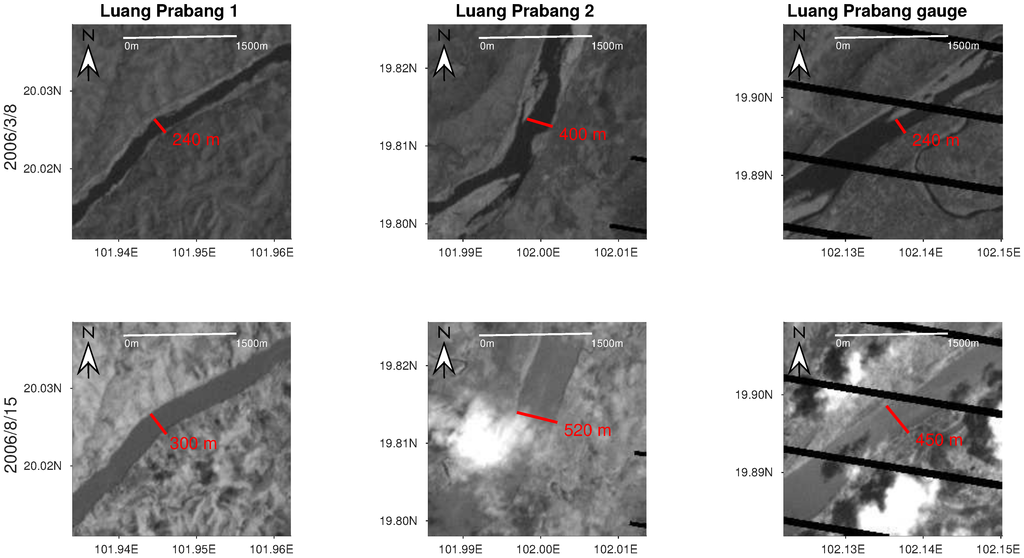 The time series of the two virtual Luang Prabang stations are compared with that of the gauge station in Figure 7 (for visual clarity, the means of all time series are removed). The virtual station Luang Prabang 1 lies ca. 20 km upstream of the gauging station and Luang Prabang 2 ca. 5 km downstream. The amplitude of the time series at Luang Prabang 1 is clearly exaggerated during periods of low water, possibly because of the changing river width. The river width at different water levels can be measured from Landsat 7 panchromatic images (data available from http://earthexplorer.usgs.gov/), with a pixel size of 15 m [38]. For this purpose, we used two 2006 images: one from the dry season in March and the other from the flood season in August. The Landsat images of the three locations at both dates are shown in Figure 8. The measured river width is also shown. The Mekong River clearly widens at Luang Prabang 2 and at the gauging station, from 400 m and 240 m during the dry season to 520 m and 450 m, respectively, during the flood season. The wet season covers many sand banks that are visible during the dry season. On the other hand, the river at Luang Prabang 1 is little expanded during the flood season (from 240 to 300 m); instead, the water rises in the valley. This effect is clearly visible in the amplitudes of the three time series.