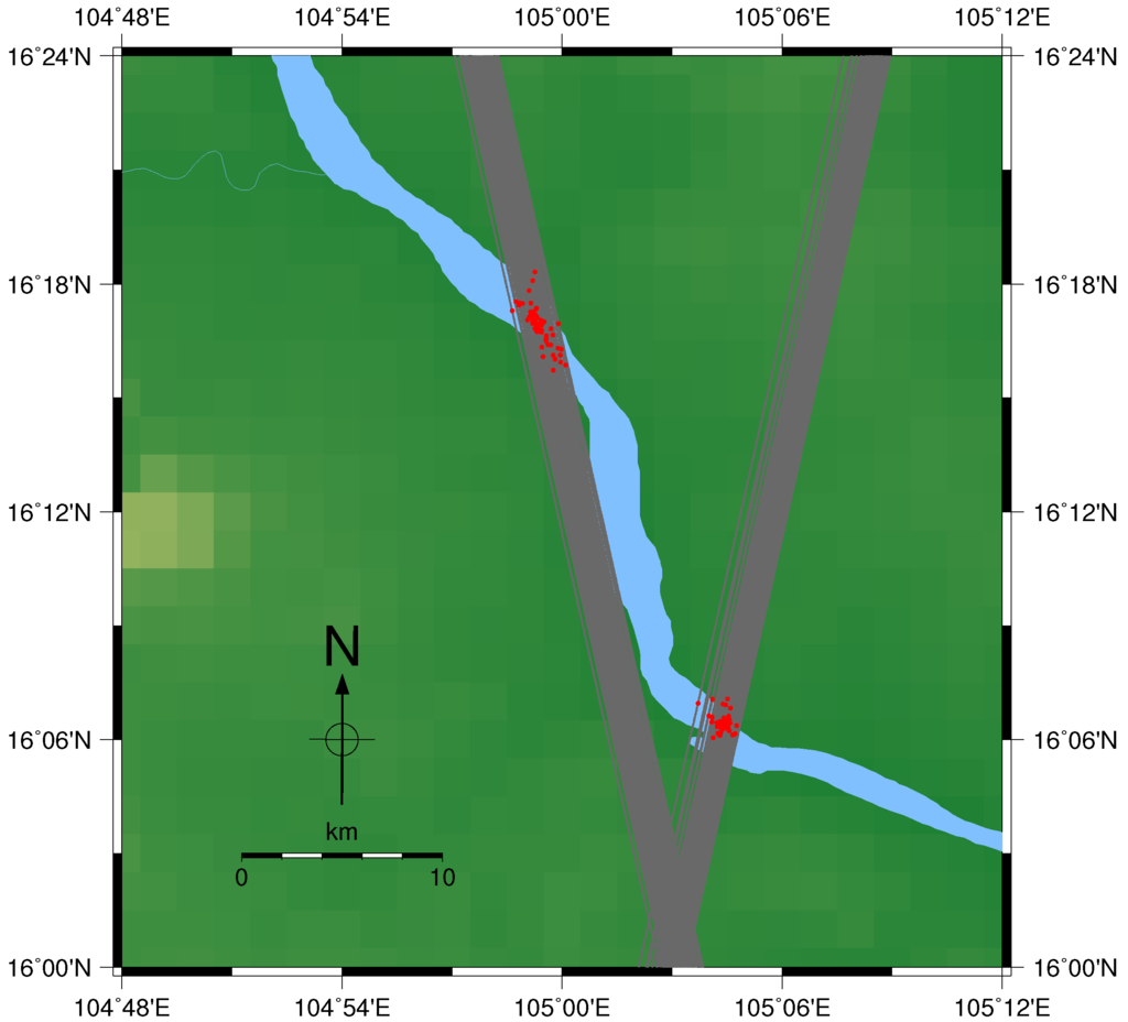 In Section 4 we discussed about possible reflections from objects other than the river. In the Mekong region the biggest concern are neighboring paddy fields which might show a strong reflectance as well. However, only a few virtual stations south of Vientiane are surrounded by rice field. In order to investigate these stations for possible non-river influences we can also use the hooking approach. Since it is not only possible to extract the height of the vertex of the hooking parabola but also its along-track position we are able to check whether the vertexes are in a close proximity to the river or not. A vertex further away of the river is probably caused by a reflection not originating from the river. In Figure 11 we show as an example all tracks and the position of the vertex for the two stations near Mukdahan which are surrounded by paddy fields. For both virtual stations all vertexes are in close vicinity to the river. Moreover, the water leverage of rice fields is season-dependent since they are only flooded during the wet season. Therefore, the reflection from the paddy fields would only degrade the measurements during these months, but we do not see any season dependency of the time series quality. Additionally, the consistency of the two parabolas we estimate for each target (see Section 5.3) can be used as indicator, that only desired reflections are included: if both parabolas fit together in height they originate most probably from the same reflector, i.e., the river.