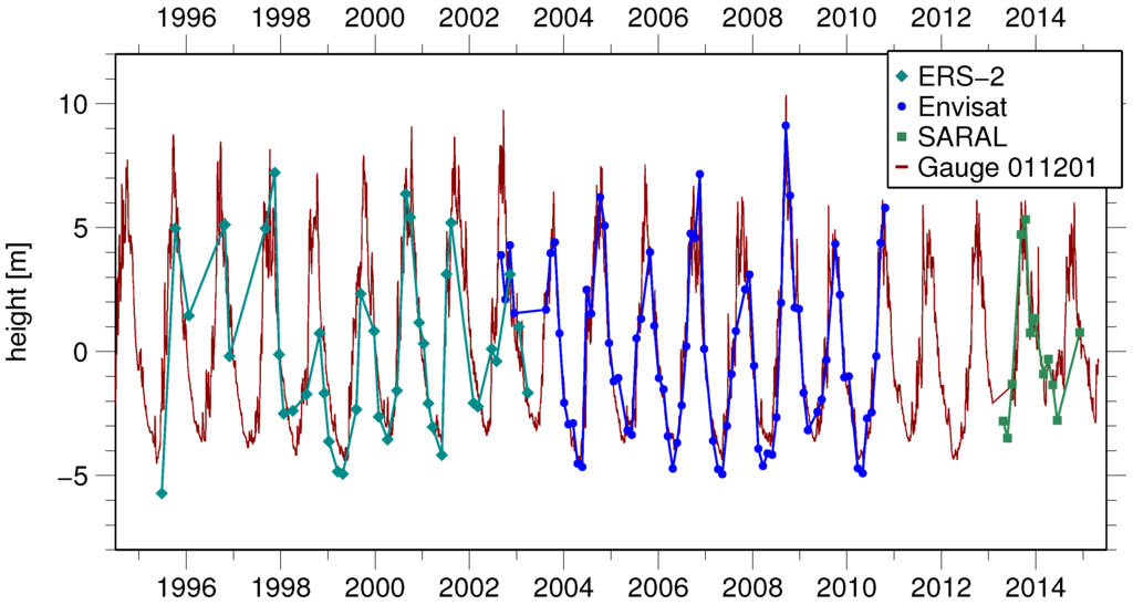 Data gaps also limited the processing of the SARAL/AltiKa data, but in this case, the gaps were caused by weather influence. SARAL/AltiKa measurements are more sensitive to atmospheric water content [39] than the other two missions, and are more degraded during the monsoon season. Nonetheless, the time series of SARAL/AltiKa derived by the hooking approach yielded good statistics (RMS = 0.76 m; R2 = 0.93 versus the gauging station data). The SARAL/AltiKa measurements should yield better results than Envisat, especially over smaller inland waters, because of the higher repetion rate (40 MHz) and smaller footprint. In fact, the time series derived from SARAL/AltiKa and Envisat were comparable in quality because the SARAL/AltiKa data are degraded by atmospheric water content.