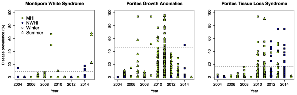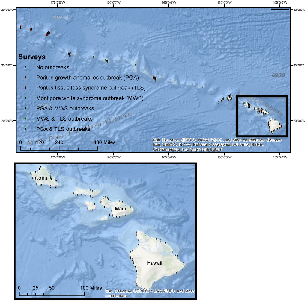 - Aeby, G.S.; Williams, G.J.; Franklin, E.C.; Kenyon, J.; Cox, E.F.; Coles, S.; Work, T.M. Patterns of Coral Disease across the Hawaiian Archipelago: Relating Disease to Environment. PLoS ONE 2011, 6, e20370. [Google Scholar] [CrossRef] [PubMed]