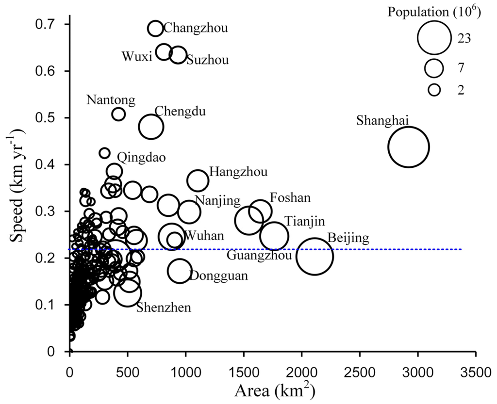 The mean speed of urbanization versus urbanizing land area for 251 Chinese major cities. The blue dotted line indicates the geometric mean value of the urbanization velocity at the national level.