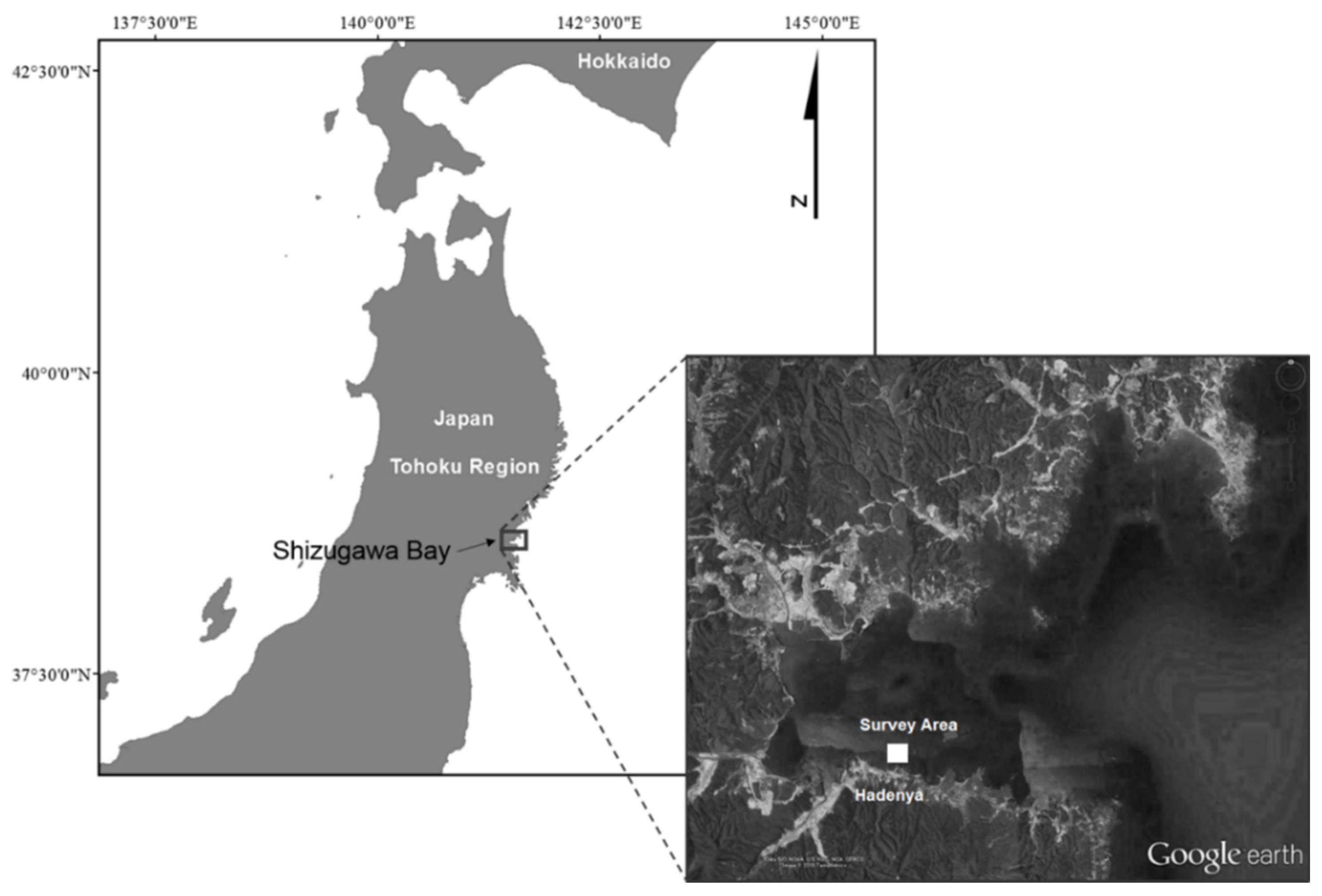 Map showing northern Japan (left panel) and Shizugawa Bay (survey area indicated), along with a satellite image from Google Earth (right lower panel).