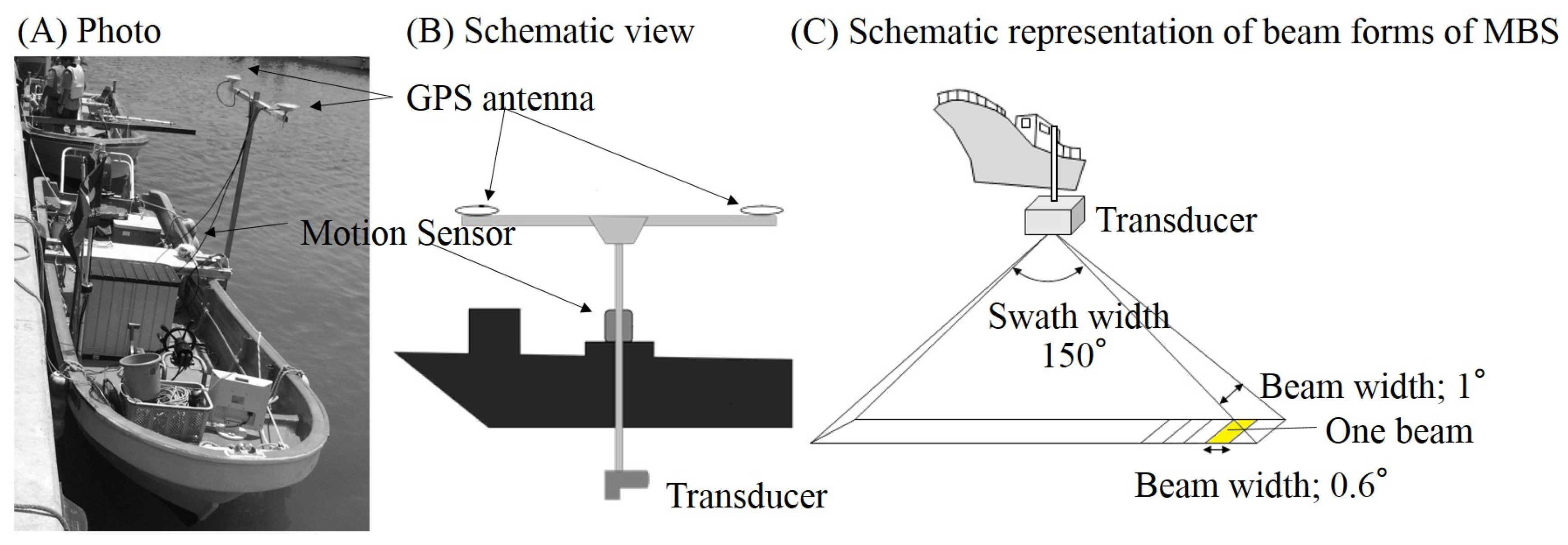 Narrow multibeam sonar (NMBS), global positioning system (GPS), and motion sensor mounted on the small boat: (A) photo of fishing boat equipped with the NMBS; (B) schematic view of the NMBS installed on the boat and (C) beam forms of NMBS.