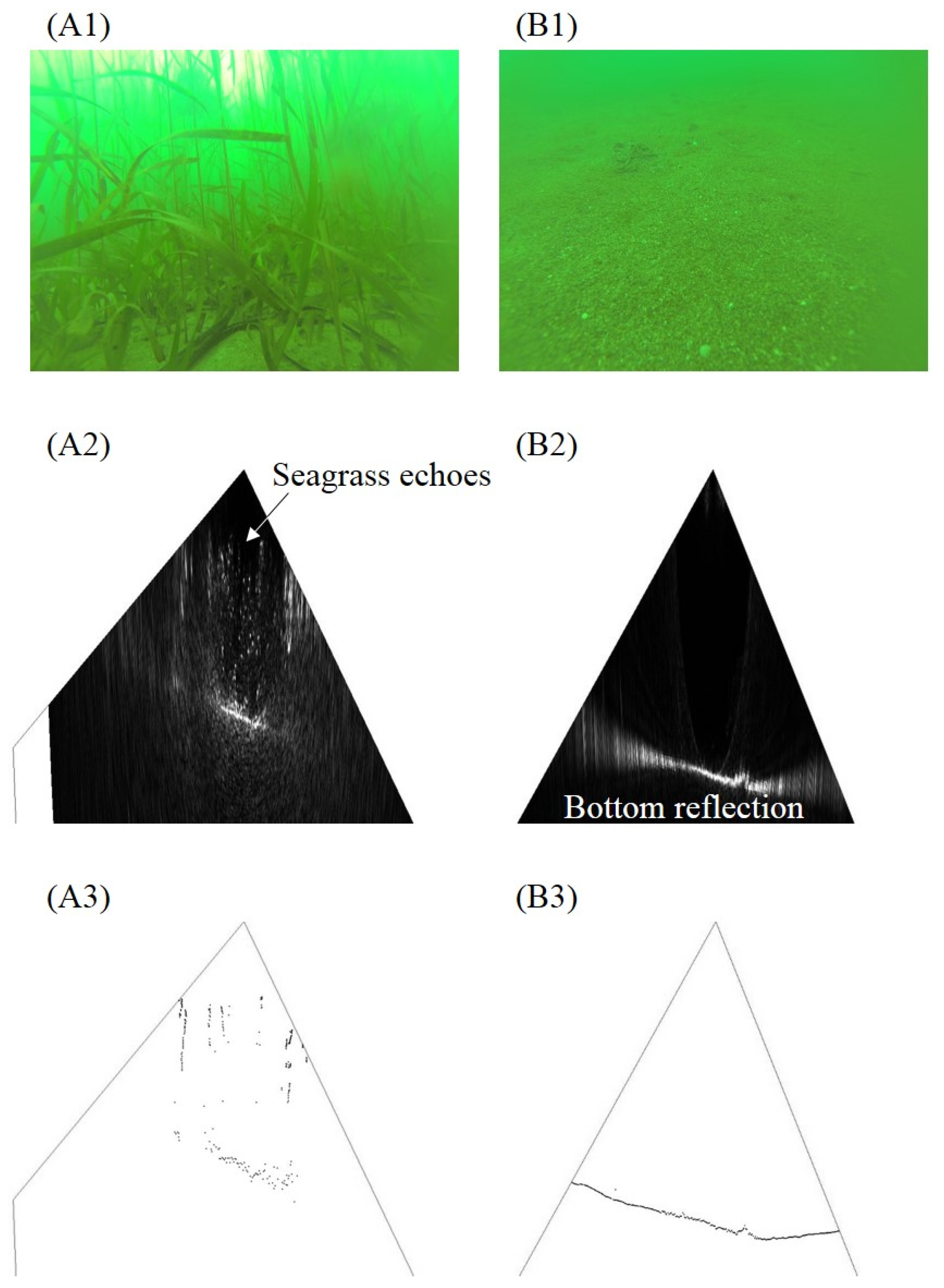 Underwater-cased camera video shots (A1,B1), water column acoustic images (A2,B2); and beam depth distributions represented with dots (A3,B3); (A,B) correspond to Stn. 5 with dense seagrass on the sand bed and Stn. 10 with only sand bed, respectively.