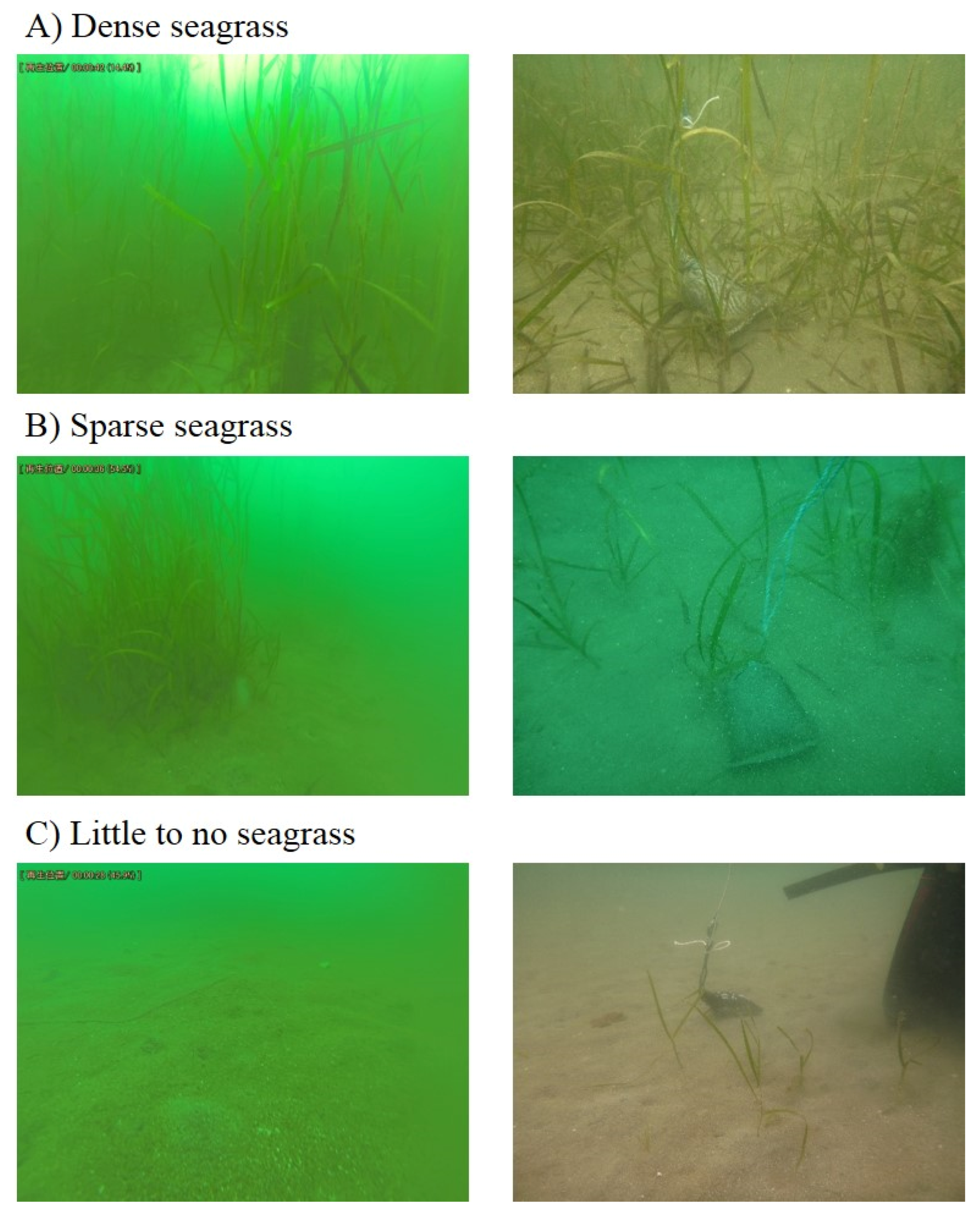Stations were visually classified into three categories of relative abundance of seagrass based on the underwater photos taken by the divers. Figure 6 shows an example of three different categories of relative abundance: dense, sparse and little or no seagrass. Categories A, B and C were assigned to Stns. 2–5 (dense seagrass), Stns. 1, 6 and 8 (sparse seagrass) and Stns. 7, 9 and 10 (little to no seagrass), respectively (Table 1).
