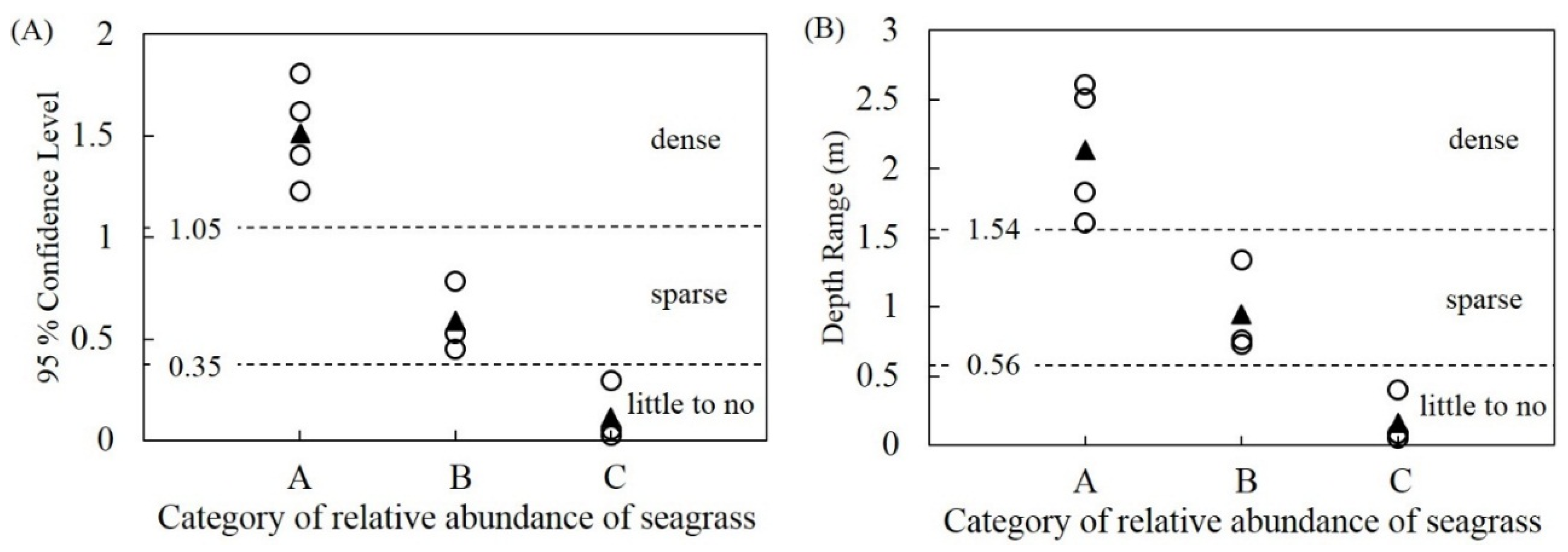 Relationship between (A) 95% CL and (B) depth range with the relative abundance of seagrass. Open circles and closed triangles indicate mean values of stations classified into each category and category means, respectively. The dashed line shows median value of each category used for the threshold between categories. The threshold values are indicated on the left side of the plot.