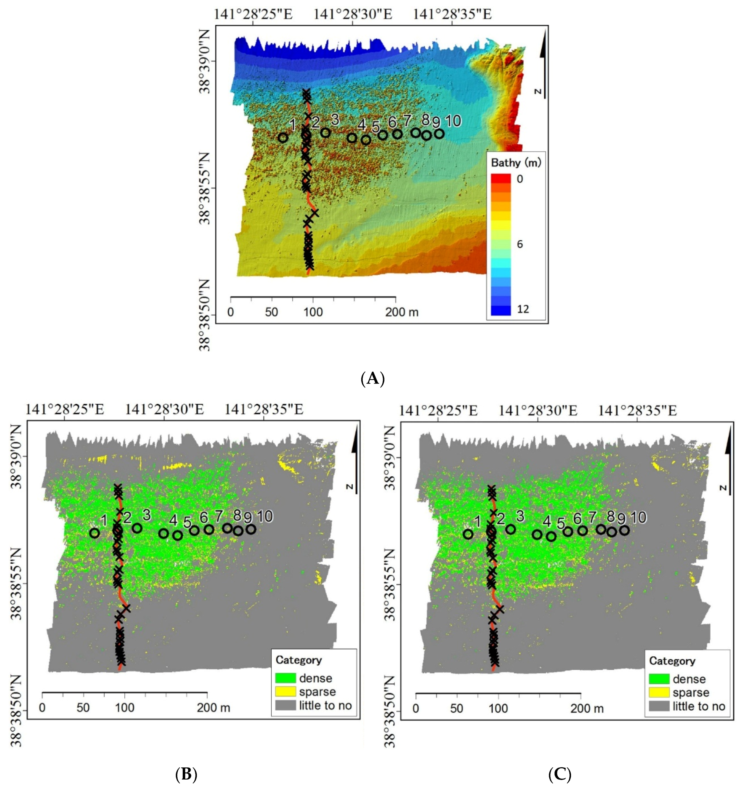 Maps of high-resolution bathymetry (A) and relative abundance of seagrass classified with 95% confidence level (B) and depth range (C). Green, yellow, and grey represent categories of dense, sparse and little to no seagrasses, respectively. Opened circles show Stns. 1–10. The red line shows a towed video survey line. The cross mark presents 30 points extracted among towed video survey line at random.