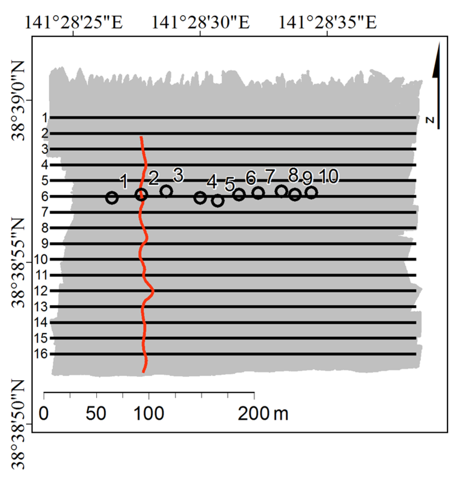 The survey area was located off Hadenya in Shizugawa Bay, facing the Pacific Coast of Japan (Figure 1). This was one of the areas most affected by the huge tsunami caused by the East Japan Great Earthquake of 11 March 2011. Tsunamis are known to cause substantial damage to coastal environments and coastal seagrass meadows []. Although the seagrass beds in our survey area were seriously affected by the tsunami of 2011 [,], the seagrass meadows have recovered to some extent. In the survey area, patches of only one species of seagrass, Zostera caulescense Miki were found on a shallow sandy bottom at depths around 6 m prior to the tsunami on 11 March 2011, and have recovered in 2014. On 17 July 2014, an area of 350 × 300 m was surveyed using a NMBS to estimate the area covered with seagrass meadows and relative abundance of seagrass.