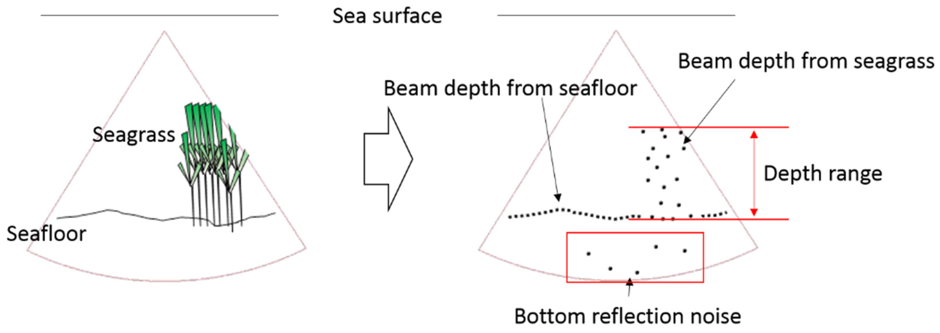 The remote sensing techniques used for seagrass mapping can be divided into two categories, optics-based and acoustics-based [], depending on the method. The former uses high-resolution satellite imagery (e.g., [,]), compact airborne spectrographic imagery (e.g., airborne Portable Remote Imaging Spectrometer (PRISM)) (e.g., []), or Light Detection and Ranging (LiDAR) (e.g., [,]). The latter uses acoustic backscatter (e.g., echosounders ([,,]), side-scan sonar ([,,,,,]), and narrow multibeam sonar (NMBS) using many beams with narrow angle in along-track and across-track directions forming a wide swath range (e.g., [,])) to map the seafloor and detect seabed features. Although optical remote sensing is suitable for large-scale mapping, it is not applicable in deep bottom or turbid waters, due to light attenuation in the water column. Additionally, this method is limited by the spatial and radiometric resolution of the satellite images, which may prevent identification of small, patchy, or low-density seagrass []. In contrast, acoustic remote sensing can be applied in highly turbid or deeper bottom waters, although it is usually applied in smaller areas due to the cost and time limitations associated with echosounder field surveys []. NMBS is one of the most effective acoustic tools for mapping seagrass, because it can survey with a broad swath to create a three-dimensional (3D) image of the seagrass meadow [].