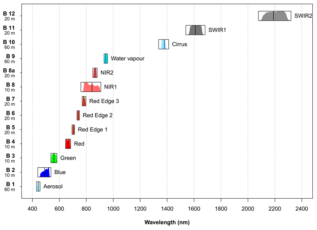 S2 carries an innovative wide-swath, high-resolution, multispectral imager (MSI) with 13 spectral bands with 10 to 60 m spatial resolution [3] (Figure 2). The first S2 image was acquired and processed on 27 June, only four days after launch [3,26]. For the present study, cloud-free Level 1C S2 images (ToA reflectance) acquired on 13 August (forest) and 30 August, 2015 (cropland), were used.
