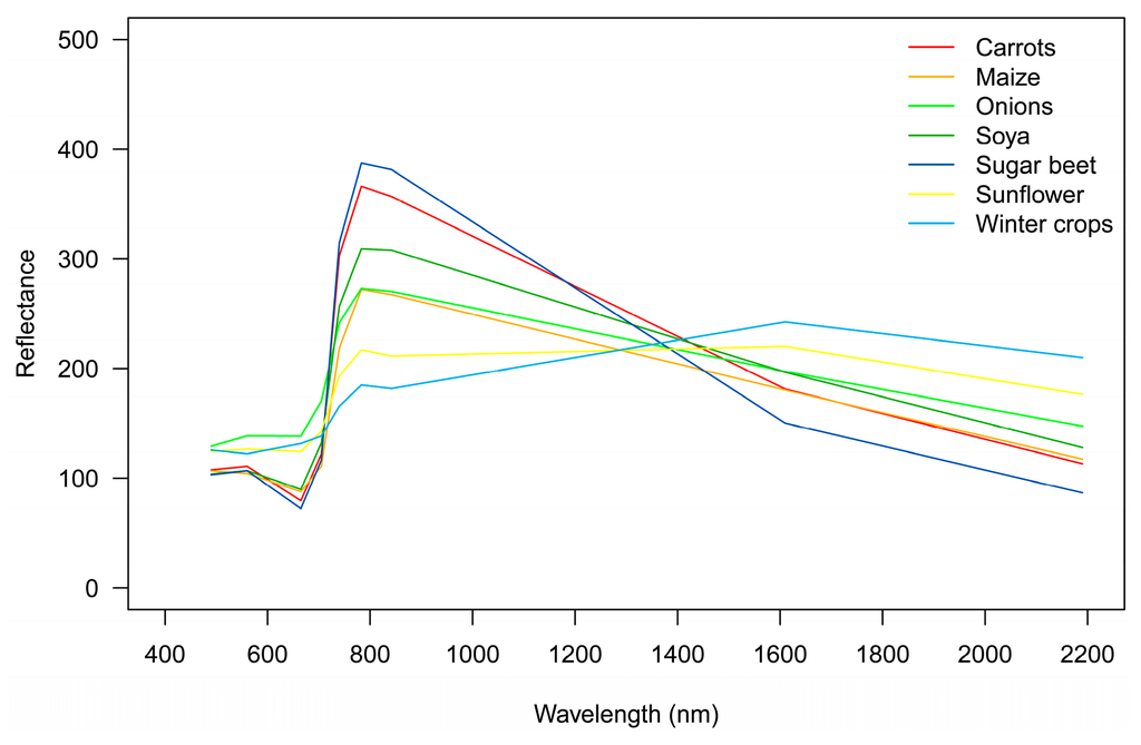 For the collection of the reference data, a field survey was carried out during the second half of August 2015. Crops were visually identified in the field. Coordinates were recorded using a GPS device. Agricultural fields with no crops were assigned to the class winter crops (harvested in June) by inspecting the crop residuals in field. A summary of the reference data is presented in Table 1. The different numbers of reference polygons reflect the prevailing cropping conditions in the study area. Average spectral signatures for the seven crop classes are shown in Figure 5.