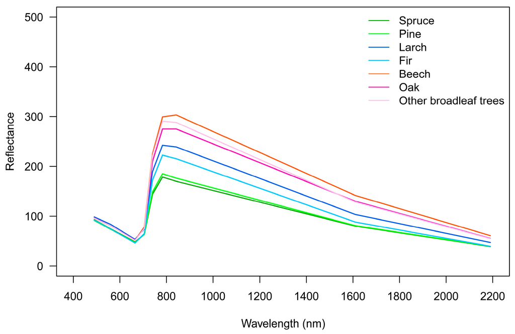 The reference data (Table 2) from the two forest test sites were combined in one dataset and jointly used for analysis. As only few reference points were available for Douglas fir, we excluded this species from the analysis. The maple-, birch-, alder and willow-species were analyzed together with European hornbeam in the class “other broadleaf trees”.