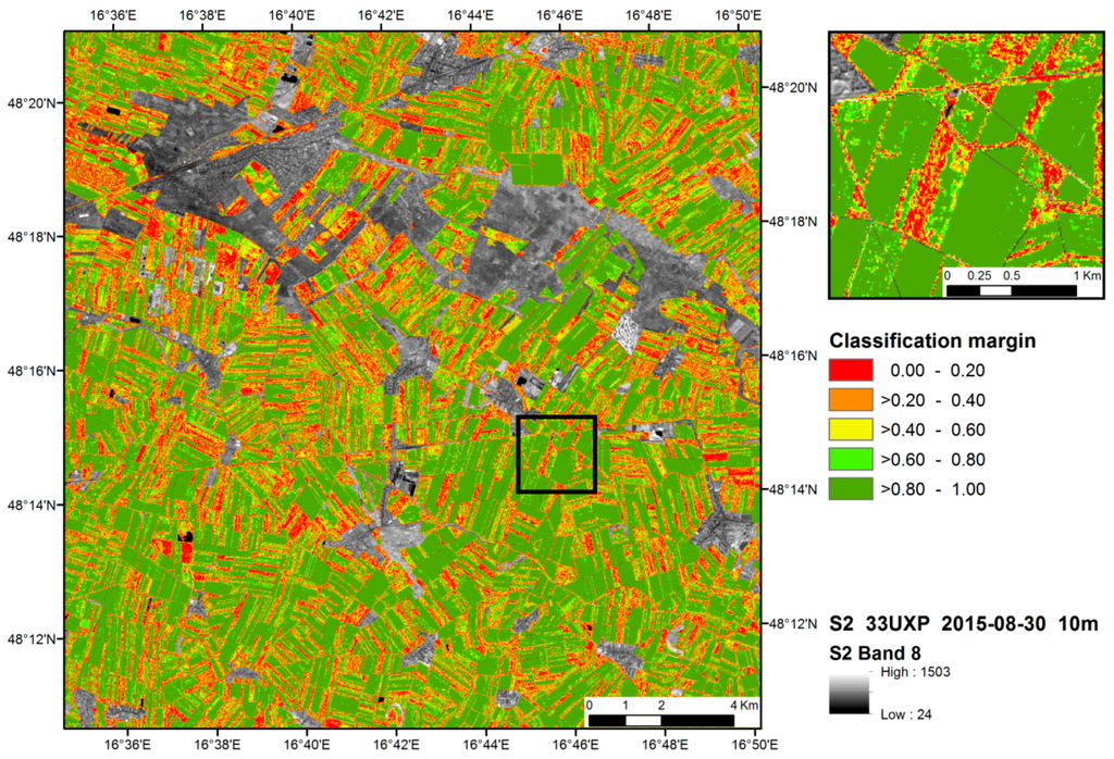 To provide a measure of classification confidence, a margin value was calculated. This involved calculating the confidence score, being as the ratio of votes of the winning class to the total number of trees used in the classification. Higher scores indicate that the classifier is more confident in assigning a class. In the second step the margin was calculated as the proportion of votes for the winning class (score) minus the proportion of votes of the second class. The margin values were calculated for the pixel-based classifications providing additional information about the map reliability [45,52].
