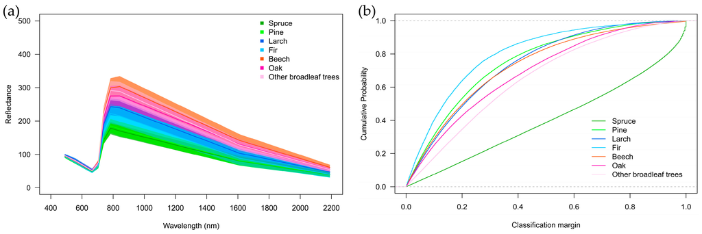 At the time of image acquisition, the seven tree species had very similar spectral shapes resulting in large spectral overlaps and often low classification margins (Figure 12). Compared to the spectral signatures of crops (Figure 8), the tree signatures look somewhat featureless and seem simply scaled along the y-axis (e.g., darker/brighter). The high(er) inter-band correlation is also reflected in the relatively uninspired principle components (Appendix A Figure A2g,h and Figure A3g,h).