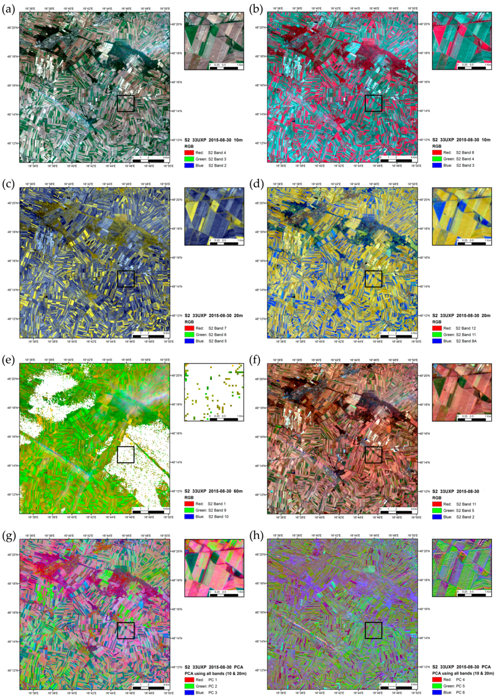 Sentinel-2 scene (30 August 2015) of the cropland test site Marchfeld, Austria. Different band combinations and PCA results (Number indicates the used data for R,G,B): (a) 10 m bands 4,3,2; (b) 10 m bands 8,4,3; (c) 20 m bands 7,6,5; (d) 20 m bands 12,11,8A; (e) 60 m bands 1,9,10; (f) 20 m bands 11,5,2; (g) PC1, PC2, PC3; (h) PC4, PC5, PC6.