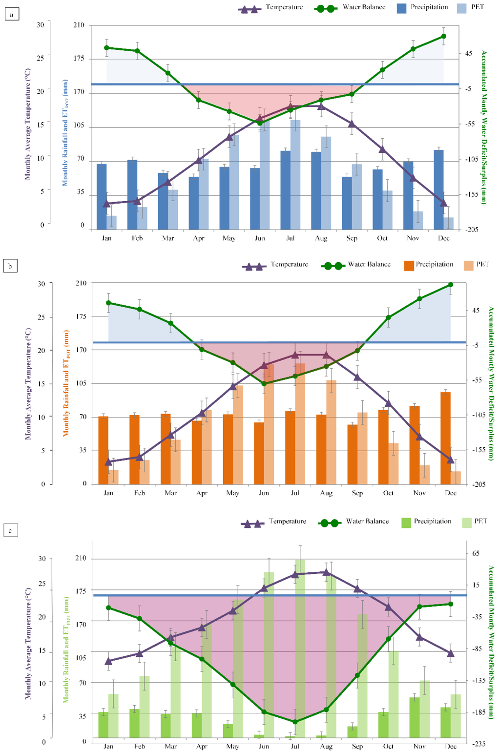 Cumulative monthly rainfall, PET (potential evapotranspiration), water balance (accumulated monthly water deficit/surplus) (mm) and average monthly temperature (°C) during the 1999–2012 period for study sites in Belgium (a); France (b) and Morocco (c). Error bars show the standard deviation for the meteorological indicators.