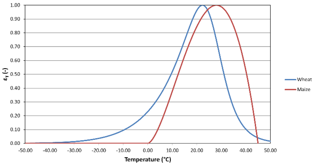 The temperature functions of εT used in this study for wheat and for maize.