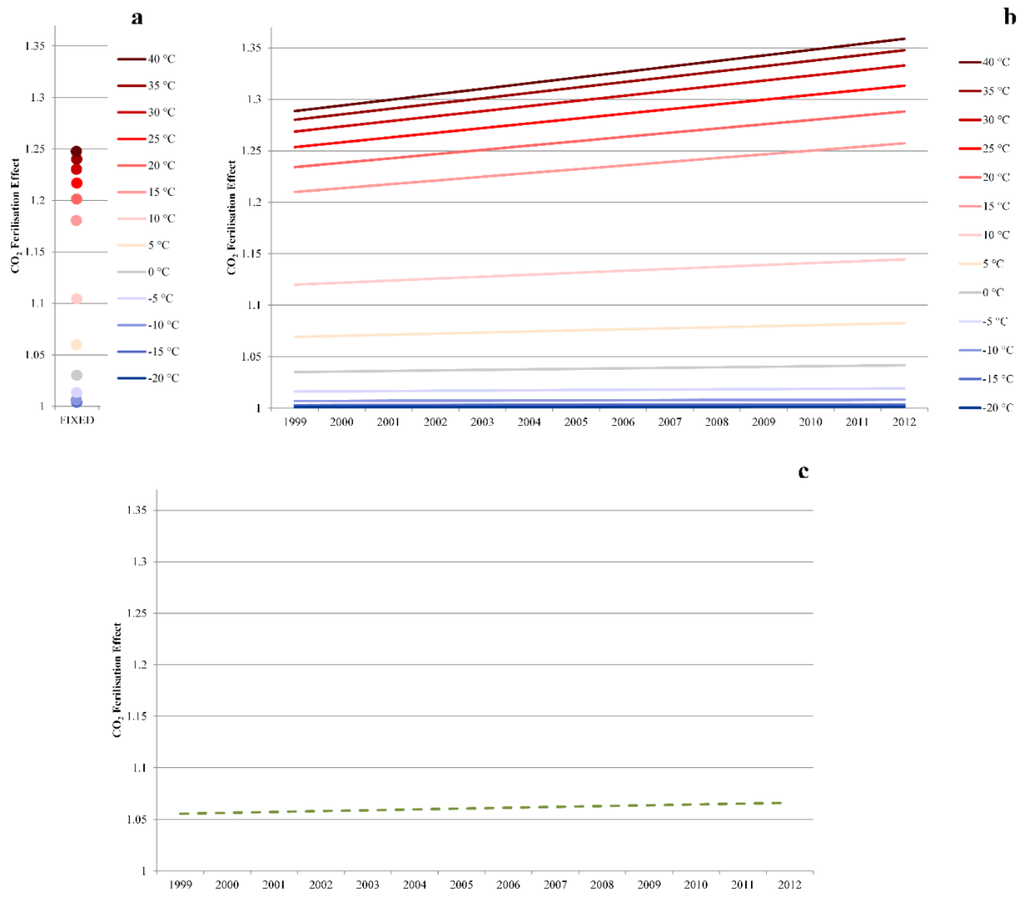 The CO2 fertilisation effect is the increase in carbon assimilation due to CO2 concentrations above the atmospheric reference level [37]. The CO2 concentration level in CGLS-DMP was fixed to a constant value, although the globally averaged records show a tendency to increase from 1980–2012 and beyond (Figure 4). In Figure 5a, the dots represent the CO2 fertilisation effect of CGDL-DMP at a fixed CO2 level with variable temperature (from −20 °C–40 °C). In order to simulate the measured CO2 increase, the yearly variable CO2 values were used in the modified DMP.