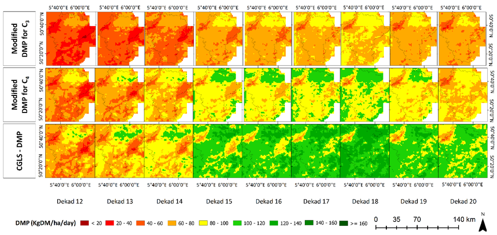 An overview of spatio-temporal information containing a comparison of modified DMP for C3 and C4 versions with CGLS-DMP is provided for Liège Region (BE) (Figure 6). These absolute values are estimated from the modified DMP for C3 and C4, and CGLS-DMP versions for different time periods during the growing season. The figure presents a clear difference between three versions of DMP.