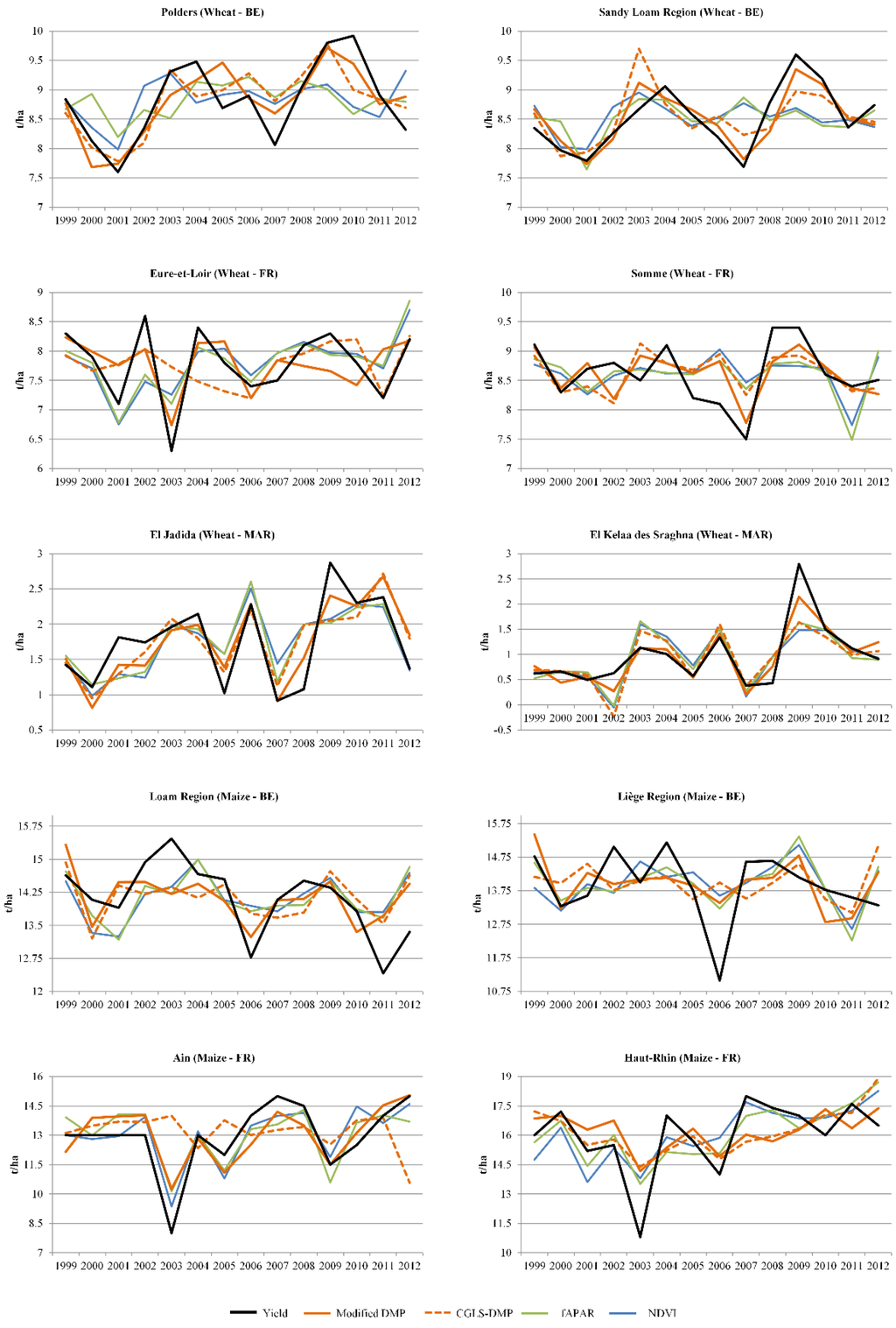 Figure 8 shows the highest R2 values for the relationship between the official yield statistics and each regional cumulative modified DMP computed with different stress factor combinations. In Belgium common wheat has the highest correlation with DMP, without any stress factors in the Polders and with DMP including CO2 fertilisation effect in the Sandy Loam Region. In France common wheat has the highest correlation with DMP, with water stress in Eure-et-Loir and DMP with CO2 fertilisation effect and temperature stress in Somme. In Morocco common wheat has the highest correlation with DMP, with all three stress factors in both El Jadida and El Kelaa des Sraghna. In Belgium silage maize has the highest correlation with DMP, with temperature and water stress factors in both the Loam and Liège regions. In France silage maize has the highest correlation with DMP, with all three stress factors in Ain and Haut-Rhin.