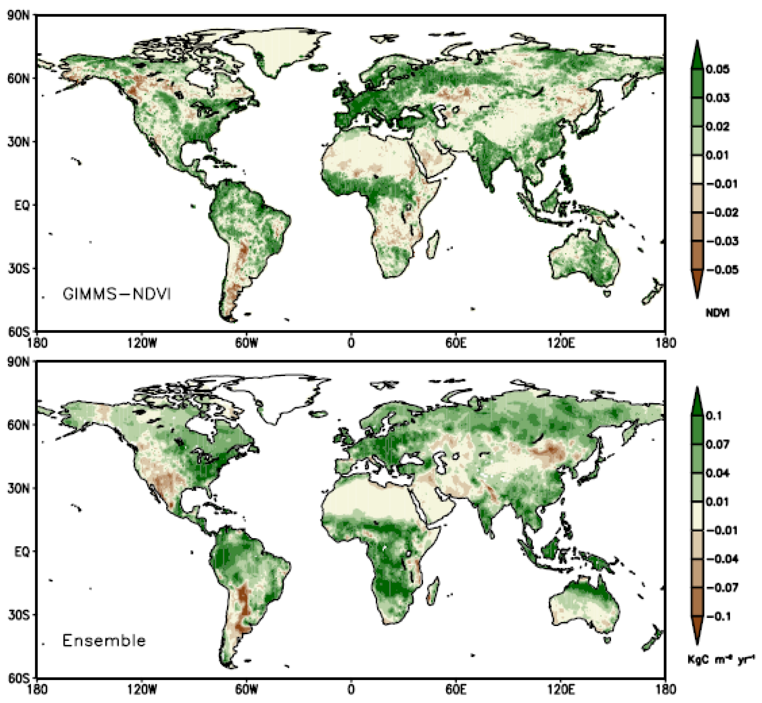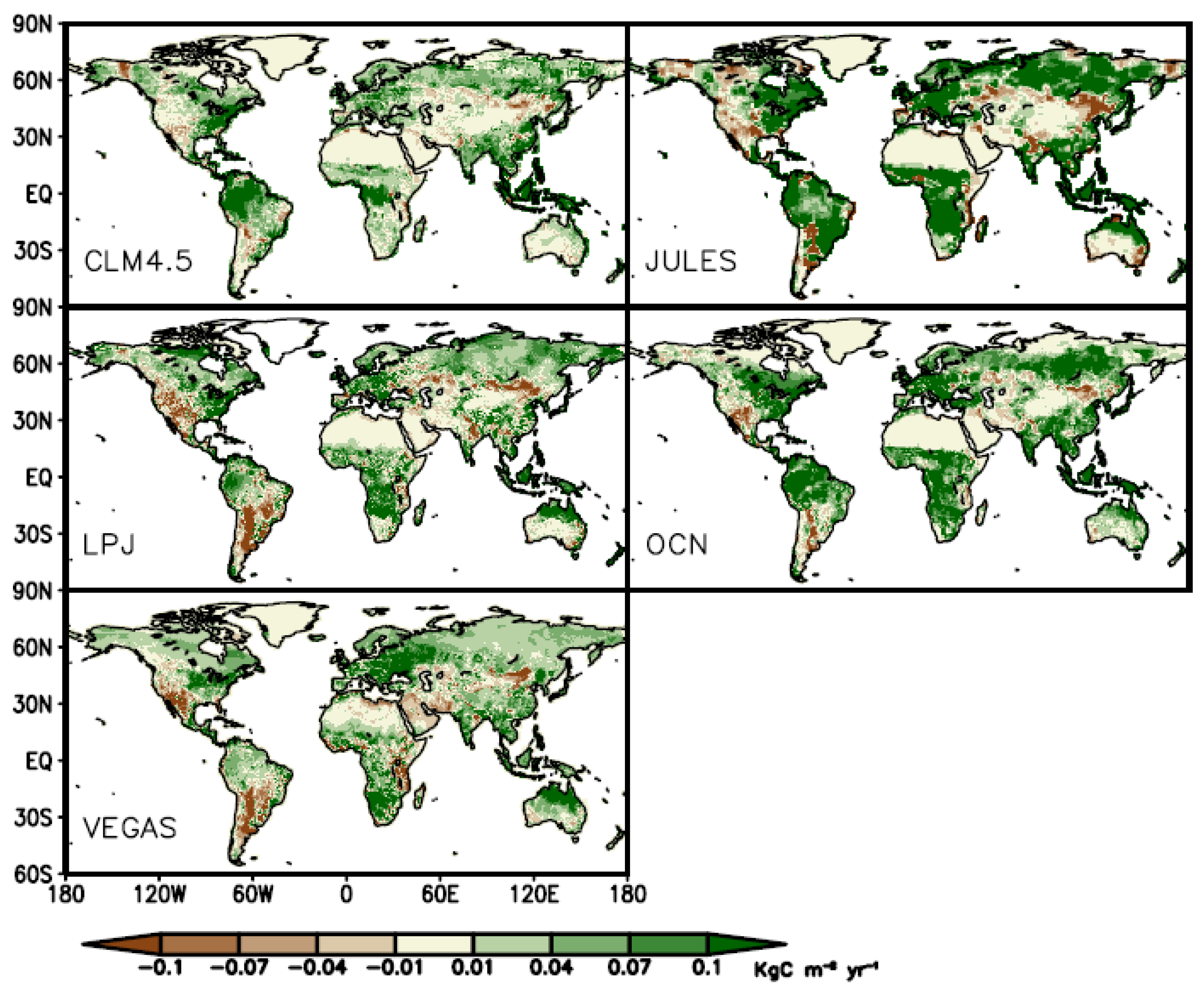 We used primarily the simulated NPP estimates from these five models for the period of 1982 to 2012. The models’ simulations were performed using the protocol established by the TRENDY project, including time variant CO2 concentrations, climate, and land use change. The CRU (Climate Research Unit) at the University of East Anglia, United Kingdom, and NCEP (U.S. National Center for Environmental Predictions) climate forcing data for the period of 1901 to 2010 was used in these simulations. The global atmospheric CO2 for the period of 1860 to 2012 was assembled at annual time steps from ice-cores and other sources by NOAA. The land-use change data for the S3 case (constant crops and pasture distribution since 1860) scenario of TRENDY simulations was obtained from the Hyde (History Database of the Global Environment) database. Further detail about models simulations can be found at http://dgvm.ceh.ac.uk/node/9.