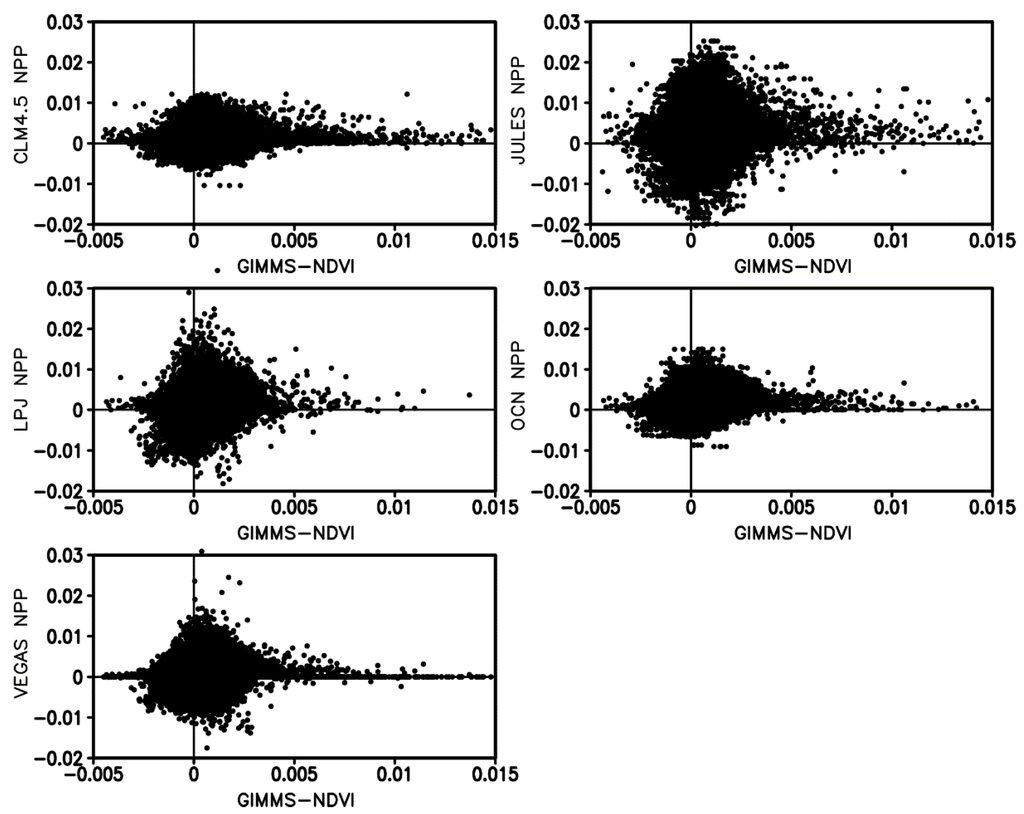Even though this study showed a general agreement between global NPP and NDVI trends (for both ensemble and individual models); the spatial patterns varied significantly. These differences between NPP and NDVI trends can be partly attributed to the identified sources of uncertainties. For example, although several calibration and corrections have been applied to the NDVI data to create the global GIMMS product, some uncertainties associated with multiple satellite sensors, solar zenith angles and atmospheric conditions/corrections remain [4,43]. Furthermore, several other factors (e.g., atmospheric conditions, scale of imagery, moisture conditions and vegetation cover) can also largely influence the accuracy of NDVI. For example, Huete and Jackson [44] found that the soil surface influence on NDVI values was greatest in areas with vegetation cover between 45%–70%, while the NDVI signal may saturate in densely vegetated regions like tropical forest [45]. Discrepancies between NPP models can be partly attributed to the representation of land cover types among models. Some models (e.g., CLM4.5) include highly sophisticated land classification with 17 plant functional types [46] compared to other models that have smaller number of plant functional types (e.g., VEGAS with 6 plant functional types). This diverse representation of land cover/class types result in a variety of different processes and associated parameter settings (relating to carbon allocation and transfer rates among carbon pools) and contribute to differences among the models [47]. Models may use different approaches for representing natural and anthropogenic disturbances (e.g., fire, land use changes, and grazing and harvesting of forest products and croplands) [48]. Benchmarking of the models’ response to different disturbances can improve the discrepancies between NDVI and modeled NPP. Climate condition is one of the major factors in regulating the NPP dynamics; therefore, some discrepancies between NDVI and modeled NPP can be attributed to the uncertainties in climate dataset due to temporal and spatial interpolation [49]. Despite the discrepancies between NDVI and modeled NPP, the results of this study provide unique and useful insight for understanding the global and regional vegetation dynamics in response to prevailing climate conditions, and their potential impact on carbon cycle.