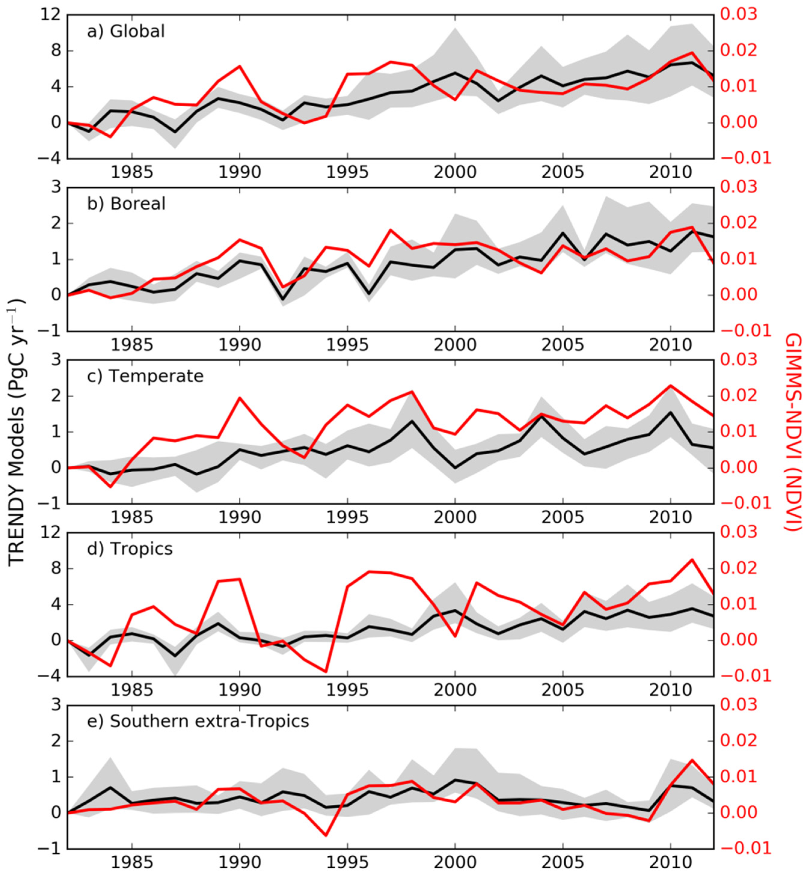 Our ability to assess and quantify the role of terrestrial ecosystems in carbon cycle is largely dependent on how well we can interpret the NPP dynamics under prevailing climatic condition. The objective of this study was to study the role of terrestrial ecosystem in the carbon cycle based on the most recent GIMMS-NDVI data and simulated NPP by five land-atmosphere models of the TRENDY project for the period 1982–2012. The results showed that simulated NPP corresponded with the NDVI trends in a temporal sense, but less so in a spatial sense. The simulated NPP, especially the mean ensemble of five models, reproduced general vegetation dynamics represented by NDVI. The global NPP was estimated to be about 63 Pg C·y−1, with an increasing trend of 0.214 Pg C·y−1·y−1. Similarly, the global mean NDVI was estimated to be 0.33, with an increasing trend of 0.00041 y−1. Overall, both NPP and NDVI showed higher positive trends in the Northern Hemisphere compared to the Southern Hemisphere. Higher trends of NPP and NDVI in Boreal regions (dominated by forests) suggest increased vegetation cover, likely due to the earlier onset and longer growing seasons. Similarly, in Temperate regions, higher NPP and NDVI trends support the suggested role of precipitation, nitrogen deposition and nitrogen fertilizer applications. We observed some NPP and NDVI decreasing trends, both in the Southern Hemisphere (possibly due to the effect of water deficit and higher temperature on plant growth) and in the Northern Hemisphere (possibly due to combined effects of regional droughts and wildfires on plant growth). A latitudinal trends analysis showed higher variations over Tropical and Extra Tropics. Overall, this study showed a general agreement between temporal trends in NDVI and the NPP, both for ensemble and for individual models simulations. Some of the discrepancies between NPP and NDVI can be partly attributed to the uncertainties associated with NDVI measurements (e.g., multiple satellite sensors, atmospheric conditions and corrections) and models formulations and assumptions (e.g., land-cover classification, associated model parameterization and interpolation effects in climate data). The scientific insight obtained from the spatial and temporal analyses of NPP and NDVI, for multiple decades encompassed in this study, is guiding our continued research on the contribution of terrestrial ecosystems to the global carbon cycle using a combination of models and observations in data assimilation mode. Our ultimate goal is to determine the regional and global magnitude of sources and sinks of carbon in terrestrial ecosystems, and their inter-annual and longer-term variability and change due to prevailing climate conditions.