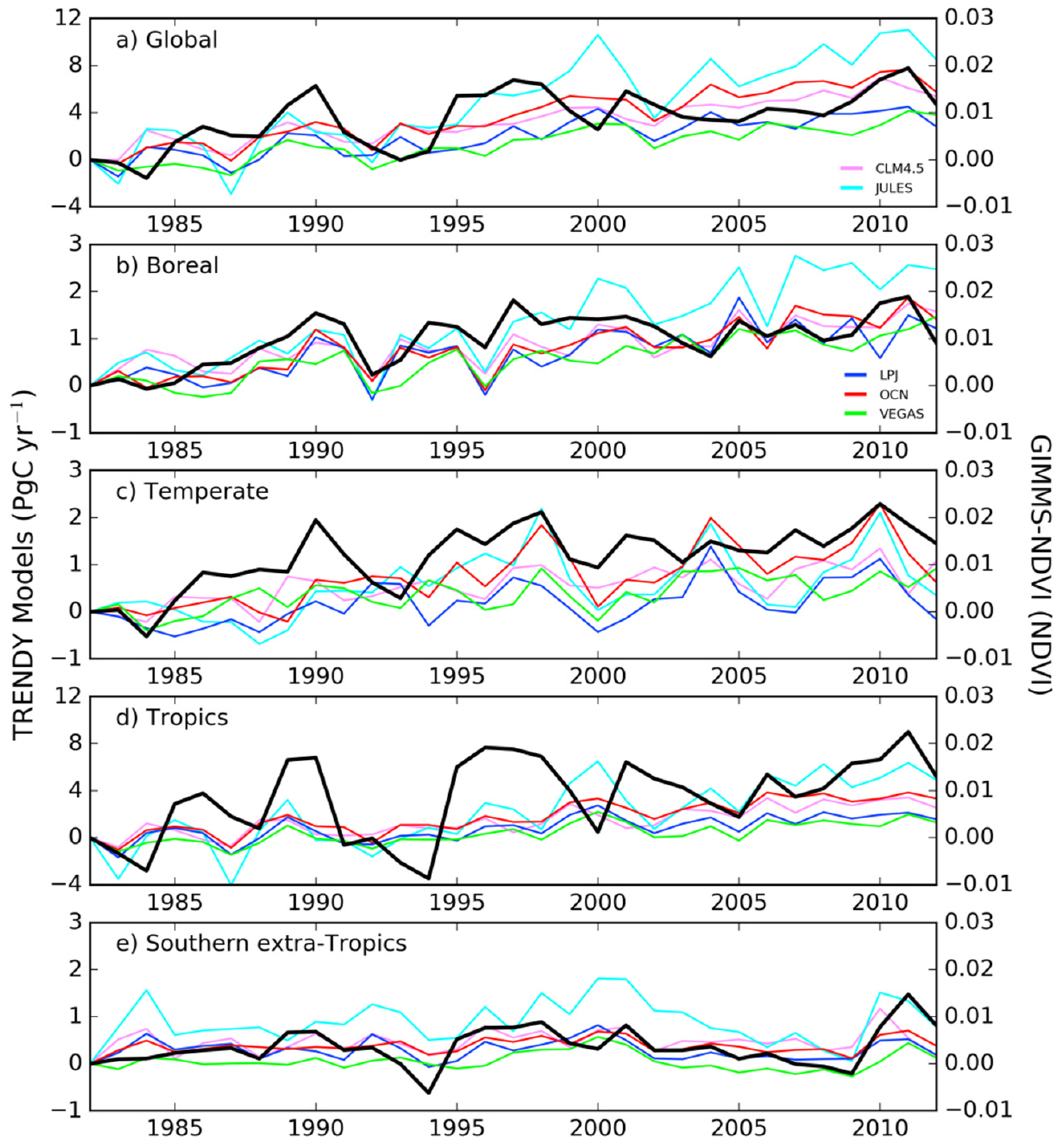 A comparison of five TRENDY models’ NPP and observed NDVI at global and regional (Boreal, Temperate, Tropics and Extra Tropics) levels, for the period of 1982–2012. Black line represents the NDVI trend.