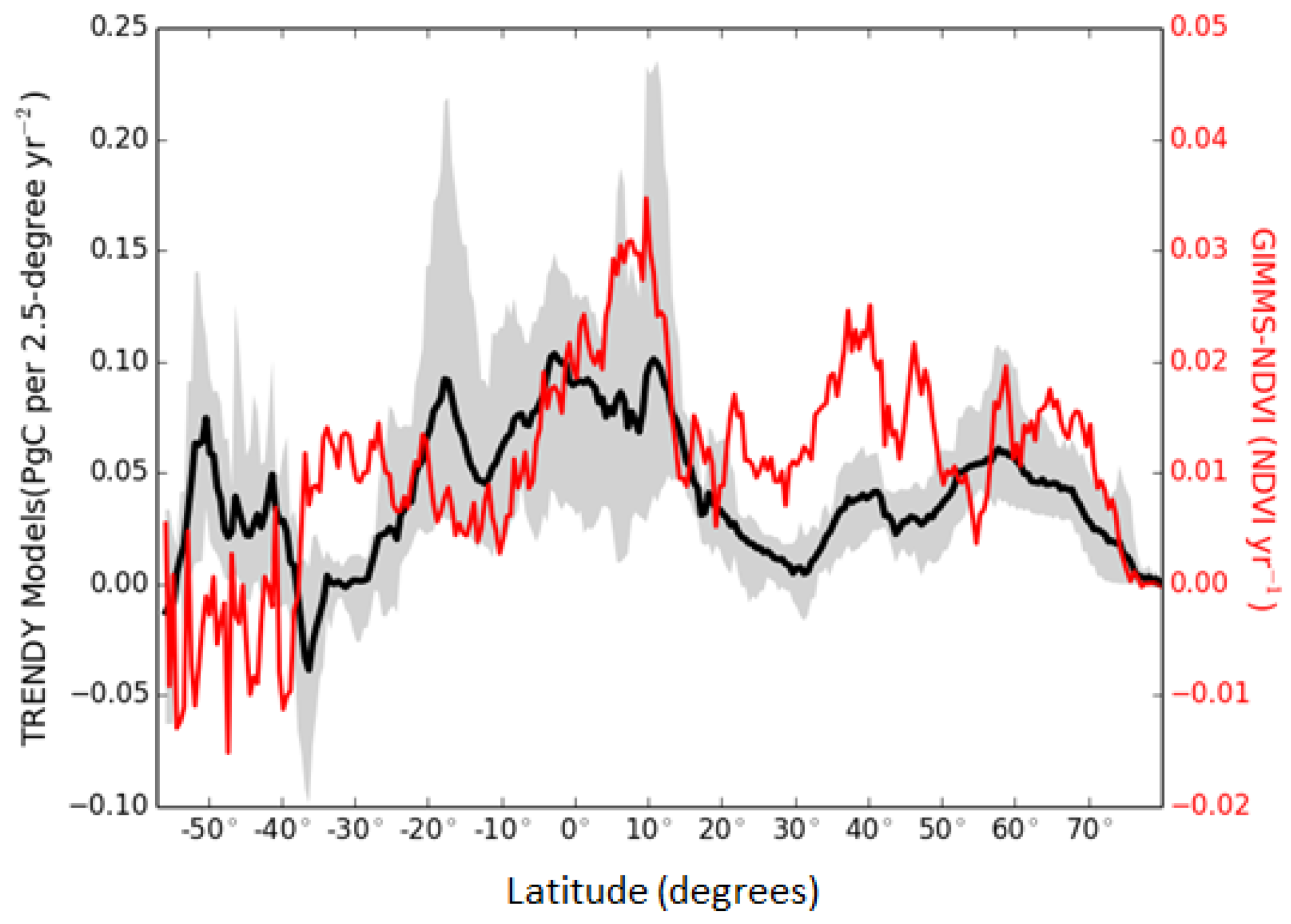 A latitudinal comparison of simulated NPP and observed NDVI trends. The thick black line represents the TRENDY multi-model ensemble, and the shaded gray area captures the models’ spread.